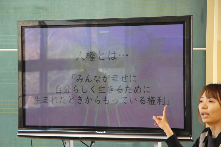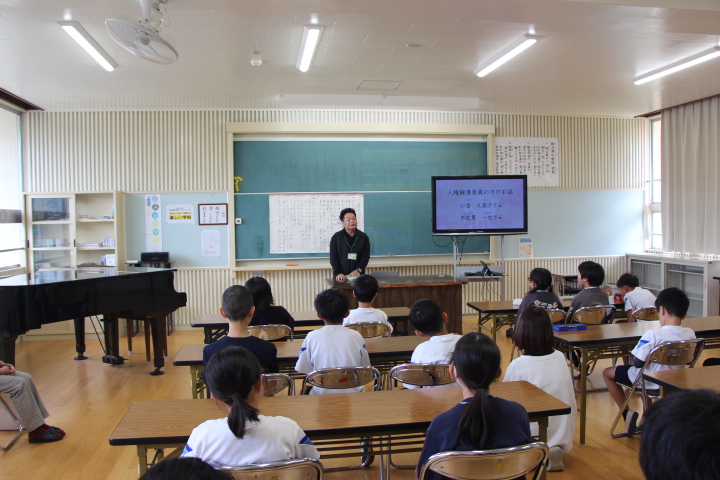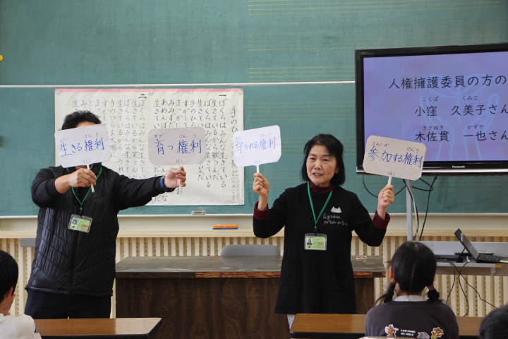 12月1日(月)~5日(金)を校内人権週間とし、人権意識を高めるための取組を行っています。その一つとして、2日(火)3校時に、人権擁護員の方お二人をお招きし、人権教室を行いました。