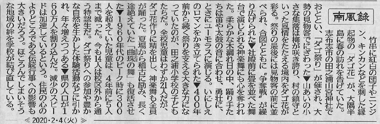 本日2月4日(火)南日本新聞「南風録」に田之浦小学校が紹介されました!ぜひご覧ください!