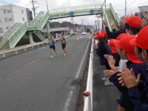 学校前の国道で,毎年恒例の県下一周駅伝応援を行いました。