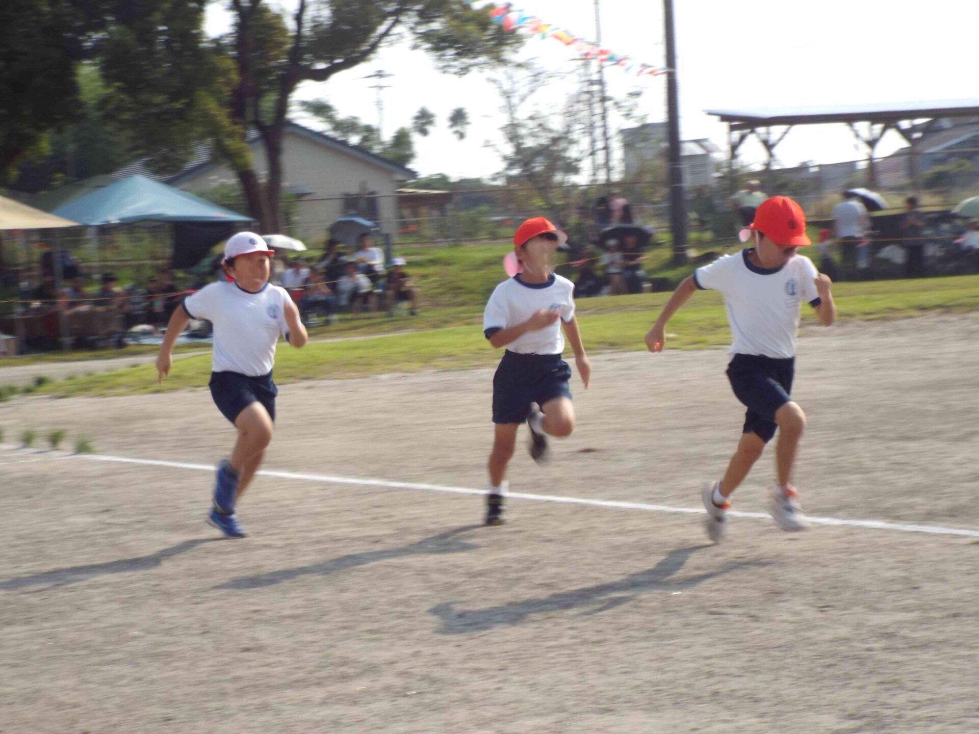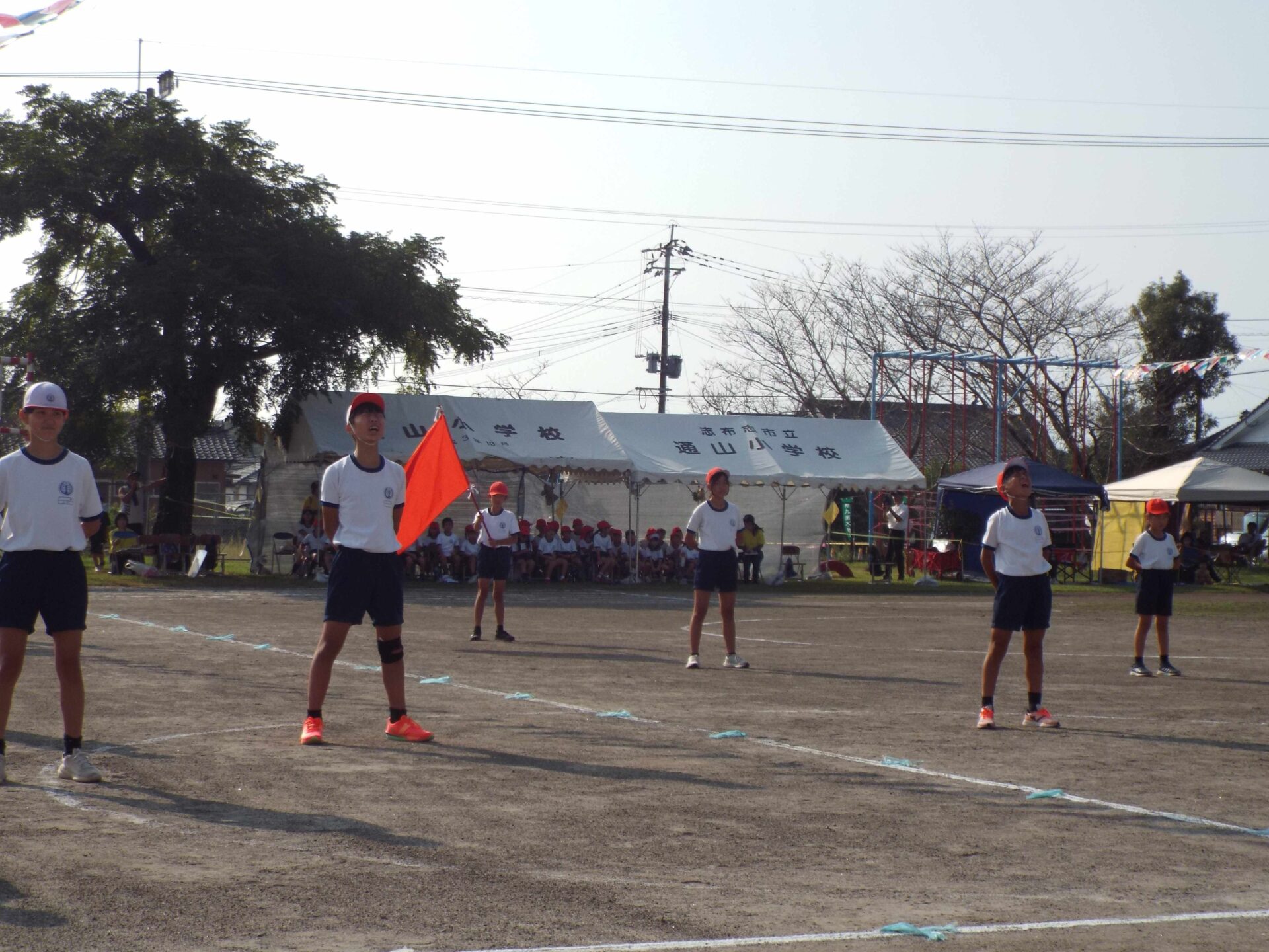 10月5日(日),澄み切った青空の下,志布志市制施行20周年記念第79回秋季大運動会を開催しました。今年の運動会のスローガンは,「全力,笑顔でつかめ優勝旗」です。1・2年生のかけっこでは,腕を大きく振り,ゴールを目指して頑張る姿やリズムに乗って笑顔で踊る姿が印象的でした。