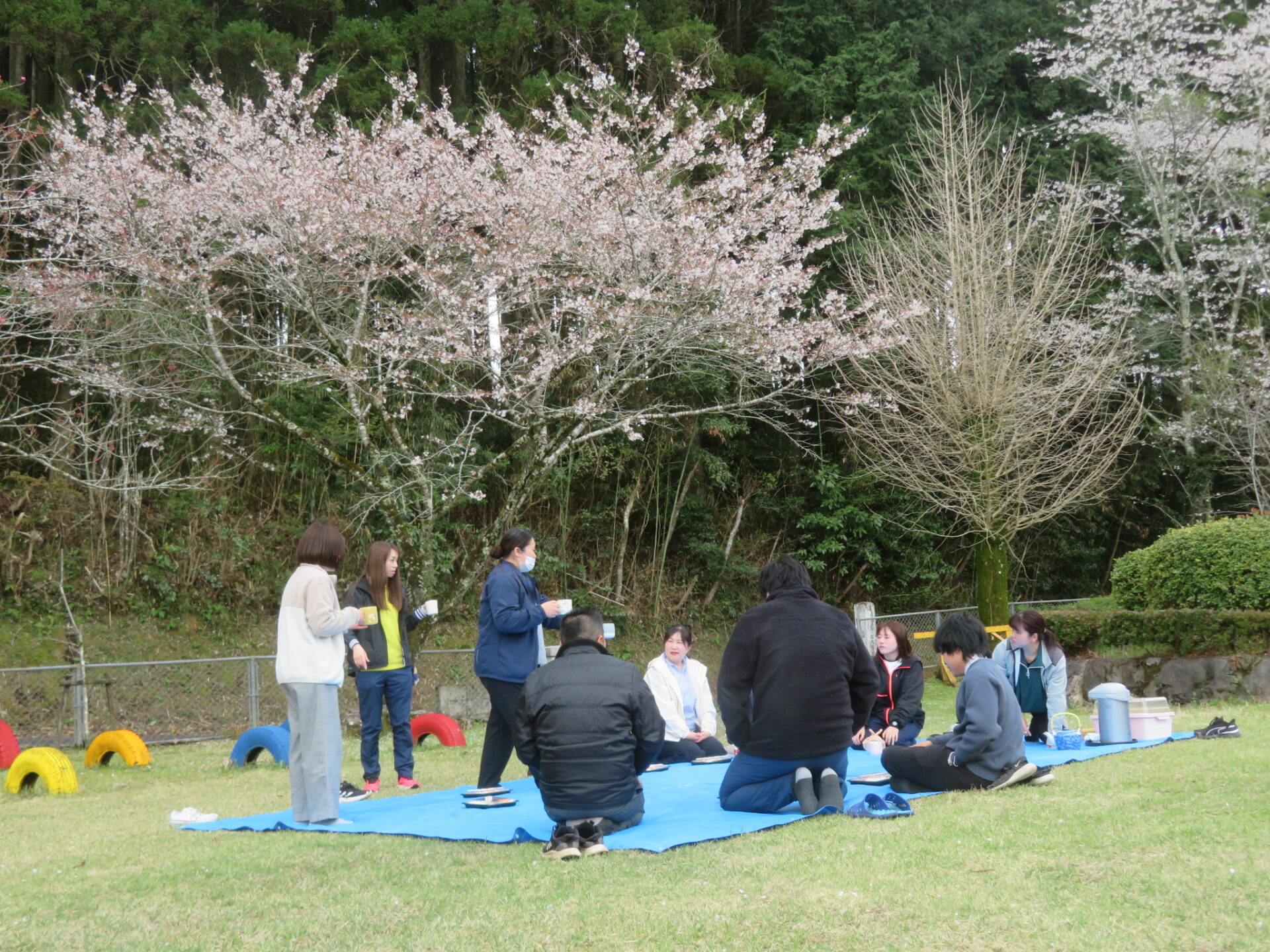 今日は、職員12人全員が揃ったので、外でお花見をしました。暖かい風が吹くと、花びらが舞って、風情があります。お茶の中に、お弁当の中に、花びらが落ちて贅沢な気分になりました。潤ケ野小には卒業記念樹の桜がぐるりと学校を囲んでいます。150年の歴史を感じる大木です。