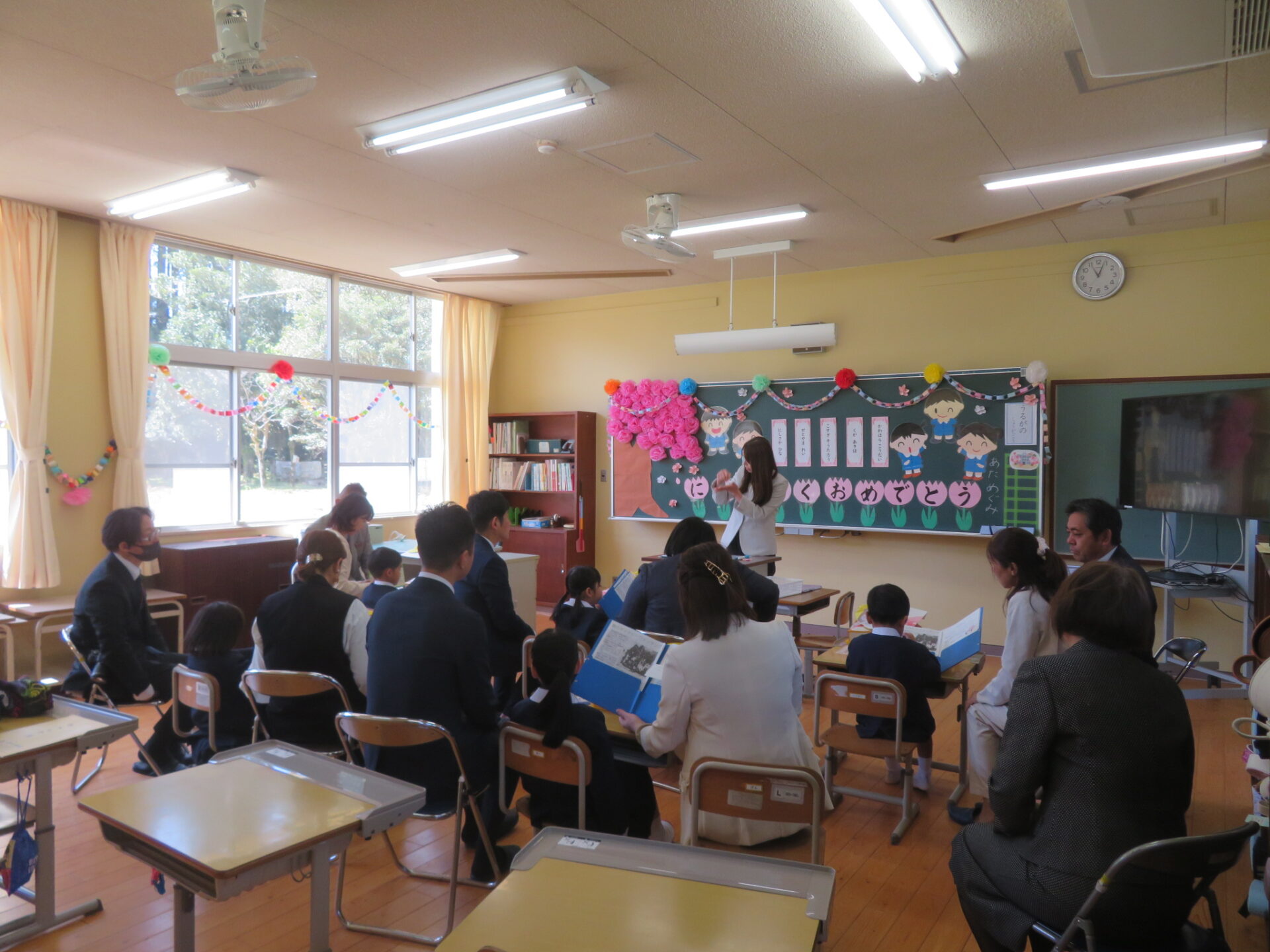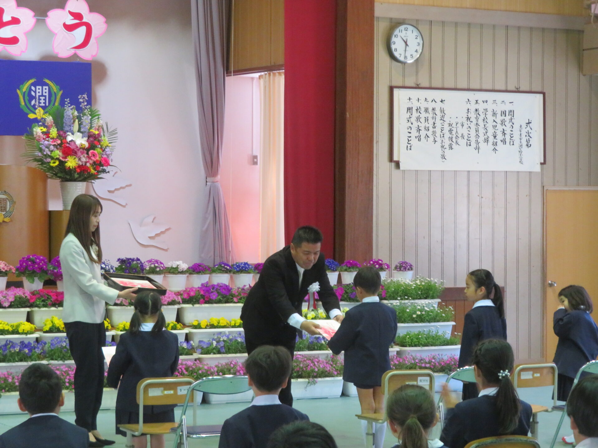 今年は、新1年生5名が入学しました。かわいらしい姿に、みんな笑顔になりました。歓迎の言葉で6年生の代表児童が、「潤ケ野小のいいところは、全校児童がみんなきょうだいのように仲良しなところ」と言ってくれました。