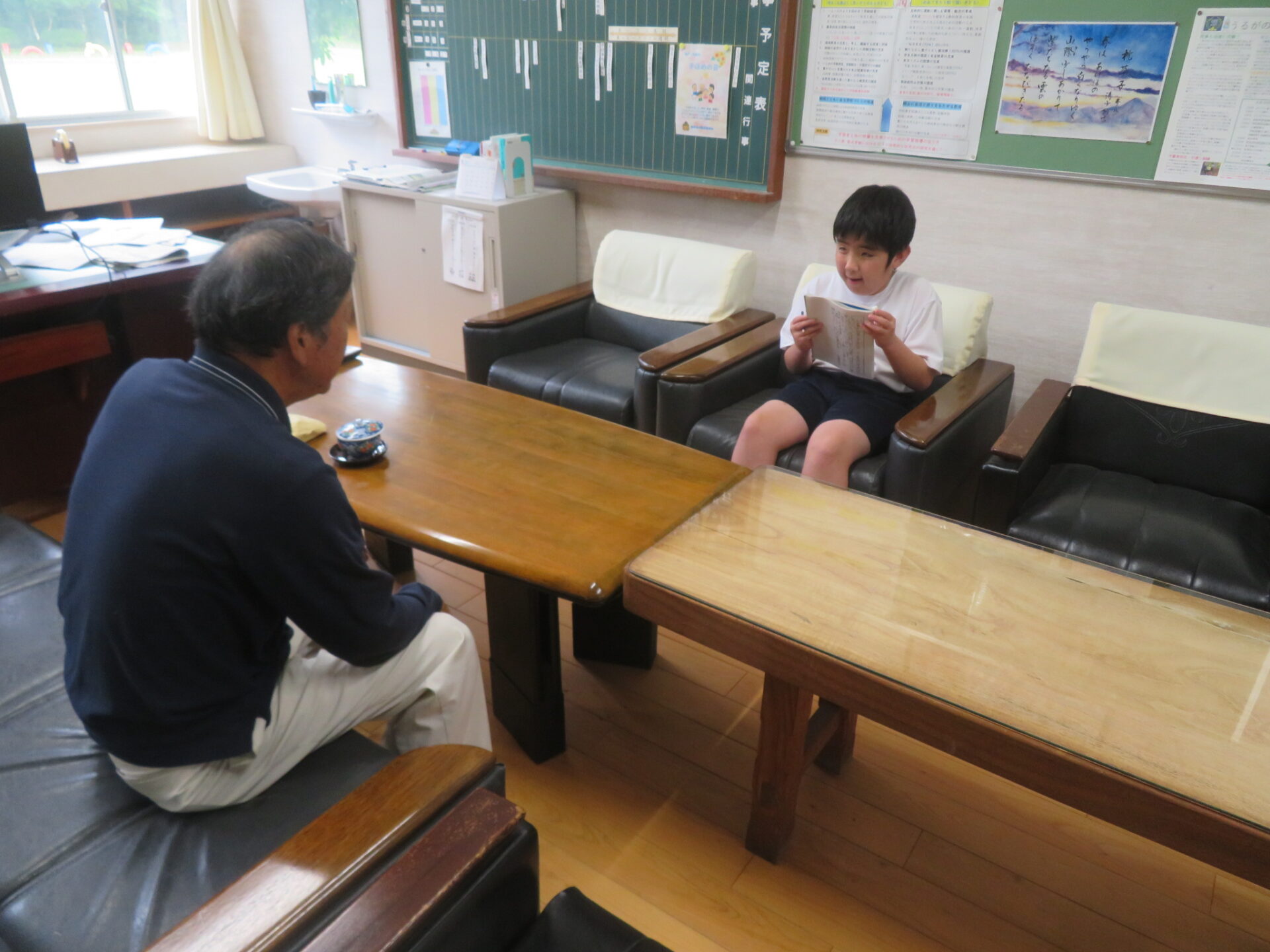 6年生が国語の学習で地域の方にインタビューをしています。今日は、長寿会(やまびこ会)会長がこられ、いろいろ話を聞きました。PTA会長とは、Zoomを使ってインタビューを行いました。