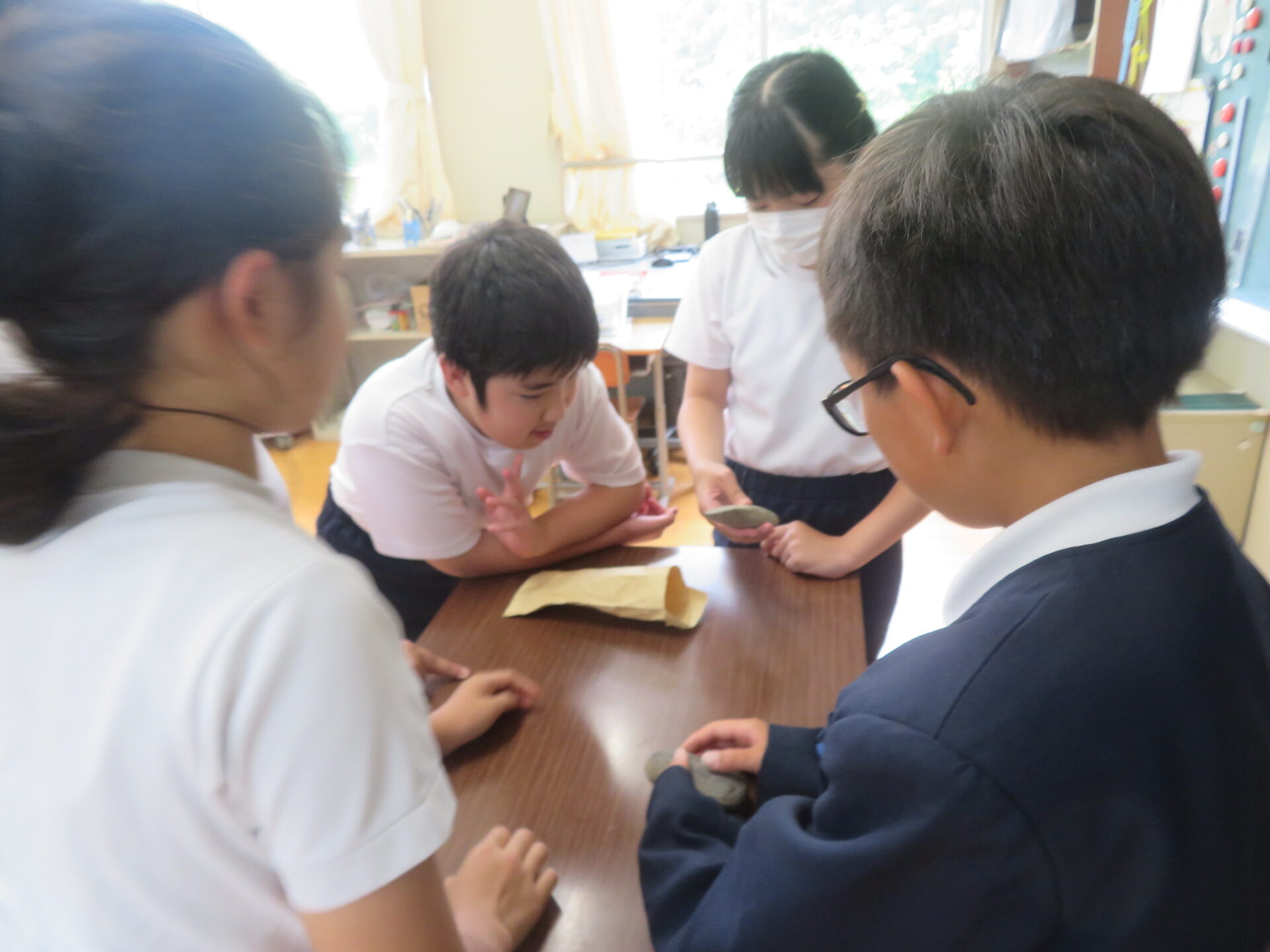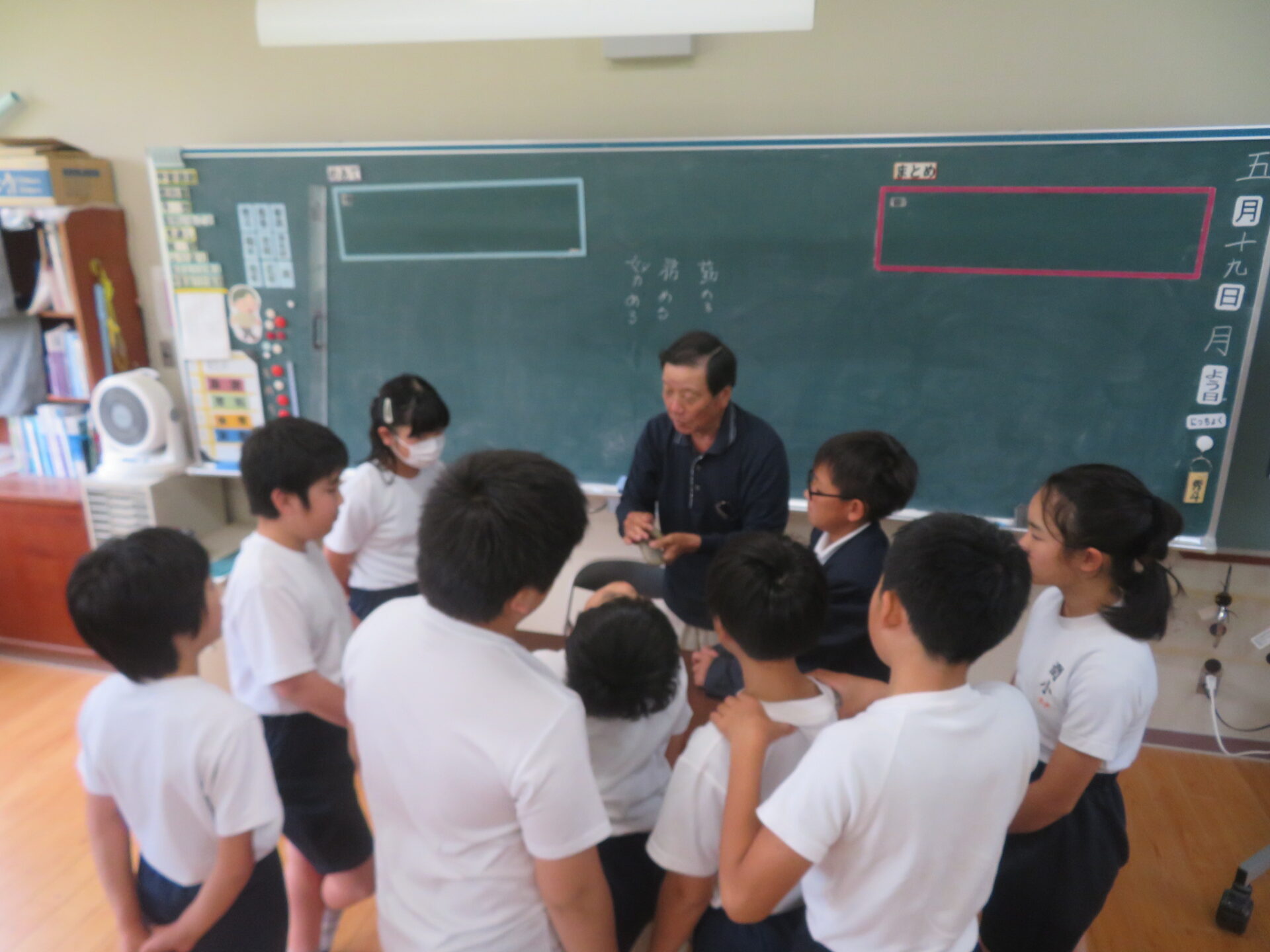 インタビューの後、長寿会長さんが、珍しい物をもってこられました。約3,000年前に使われていたと思われる石器です。すべすべして、先がとがっていました。貴重な物を見せていただきました。