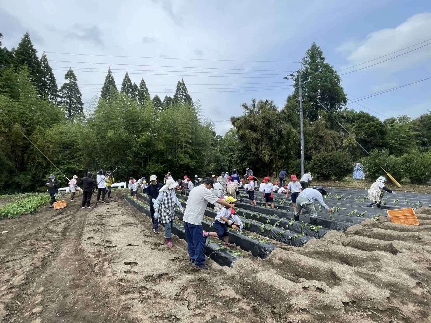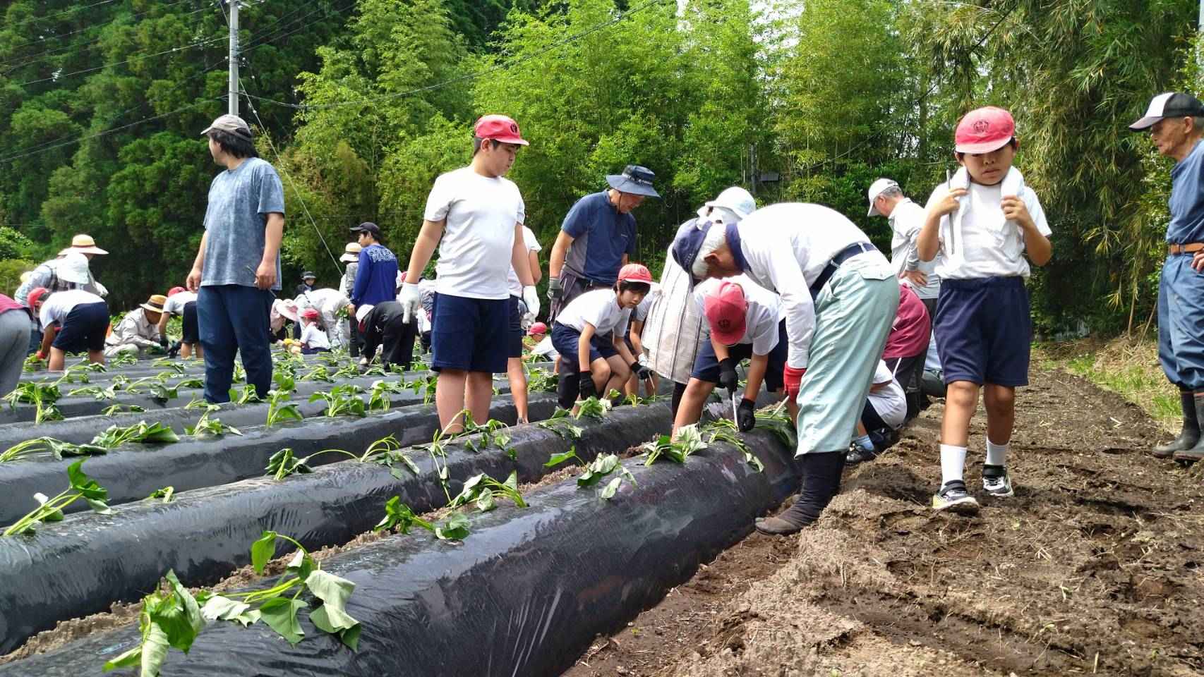 学校園に、サツマイモの苗植えを行いました。今年もやまびこ会のおじいさん、おばあさんと一緒に、教えてもらいながら植えました。NHKの方も取材に来てくださいました。