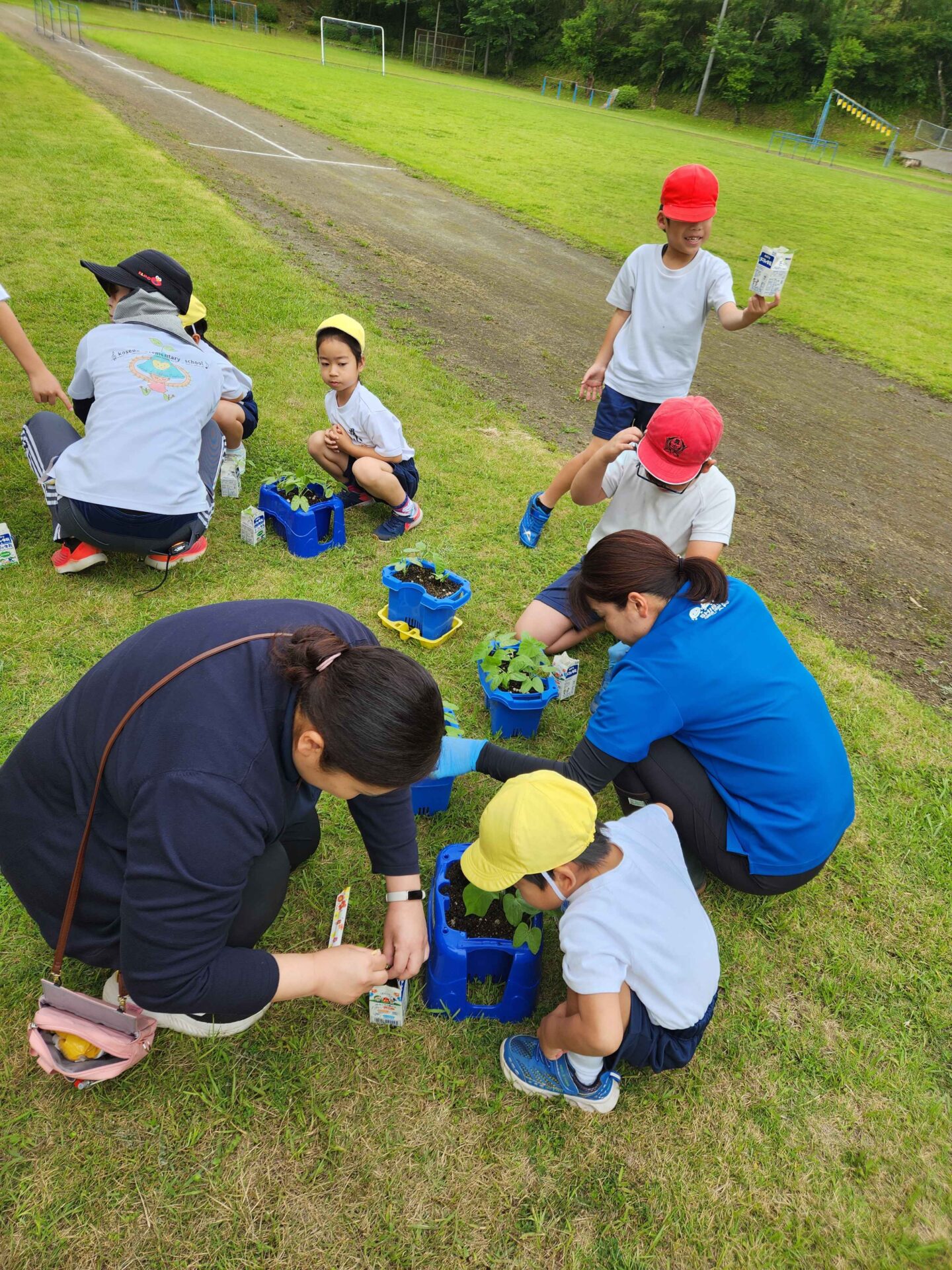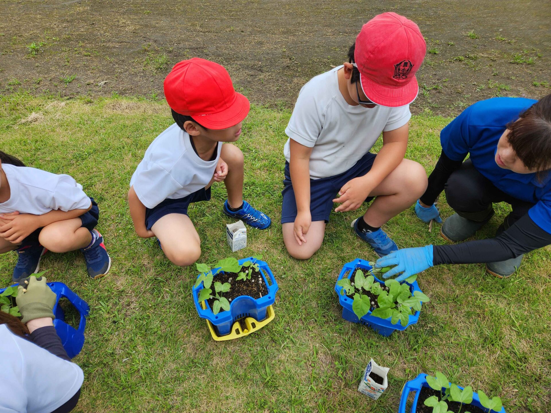 1、2年生は、アサガオの間引きを行いました。双葉と本葉をさわりながら、形や手触りの違いに気づいていました。