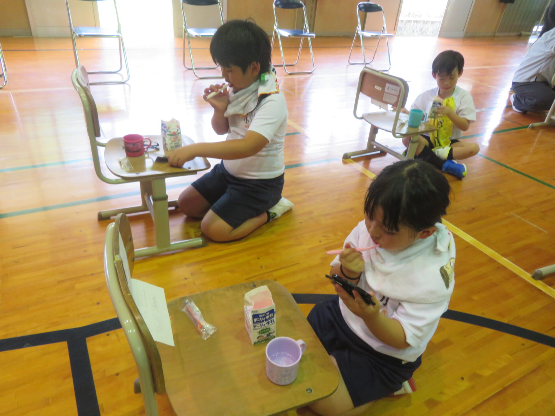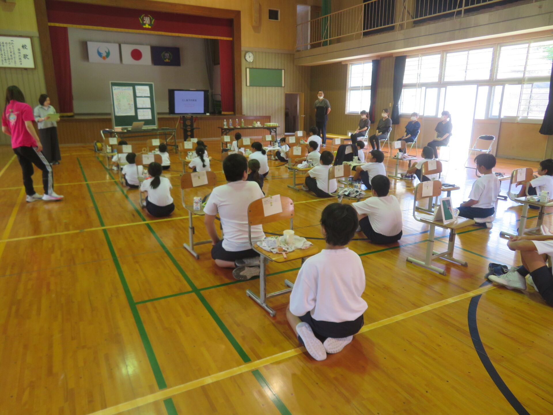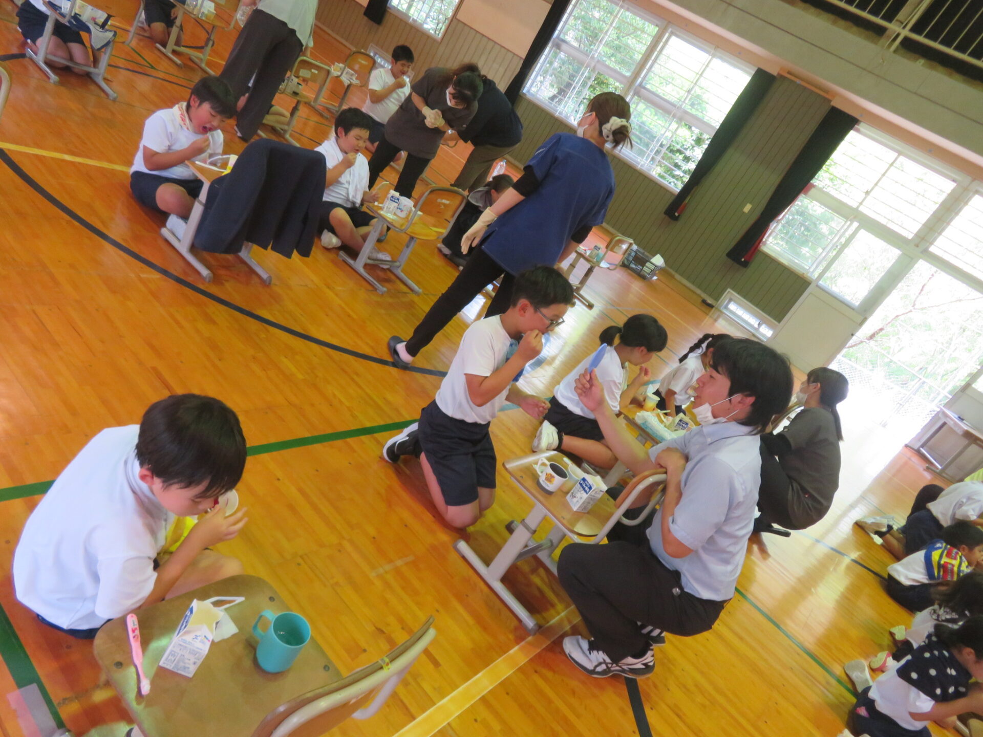 学校歯科医の先生と歯科衛生士の方々が来校され、むし歯予防教室を行いました。いつもしっかり磨いているはずの歯ですが、思った以上に歯垢が残っていました。今日のポイントは、①順序を決めて歯をしっかり磨く ②だらだら食べない ③よくかんで唾液をしっかり出すでした。