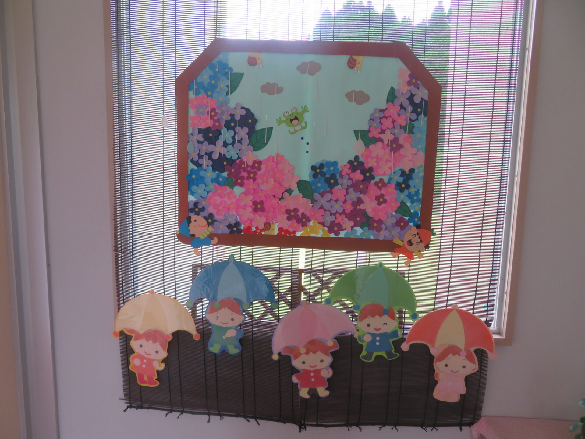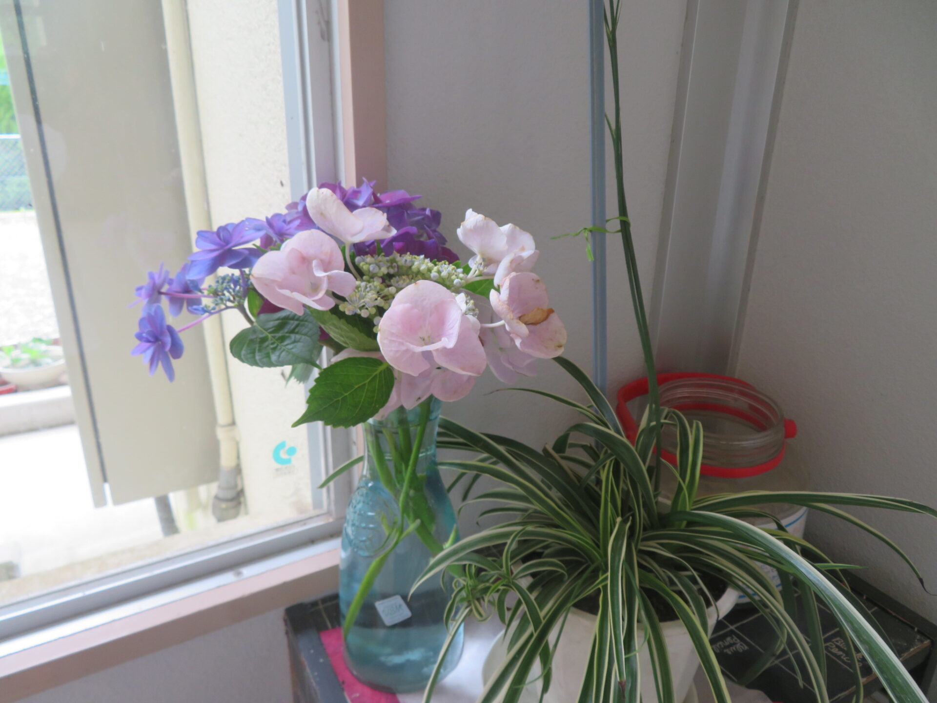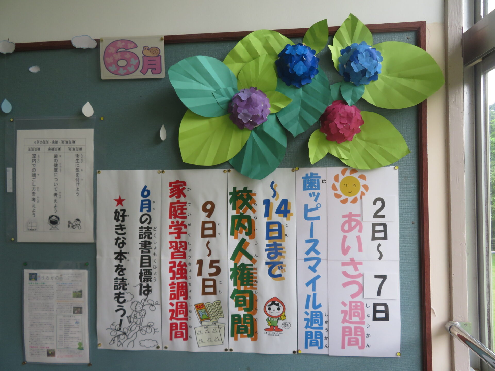 さて、あじさいの季節です。学校の周りにも色とりどりのあじさいが咲き、とてもきれいです。学校の中にも、あじさいがたくさん登場しています。