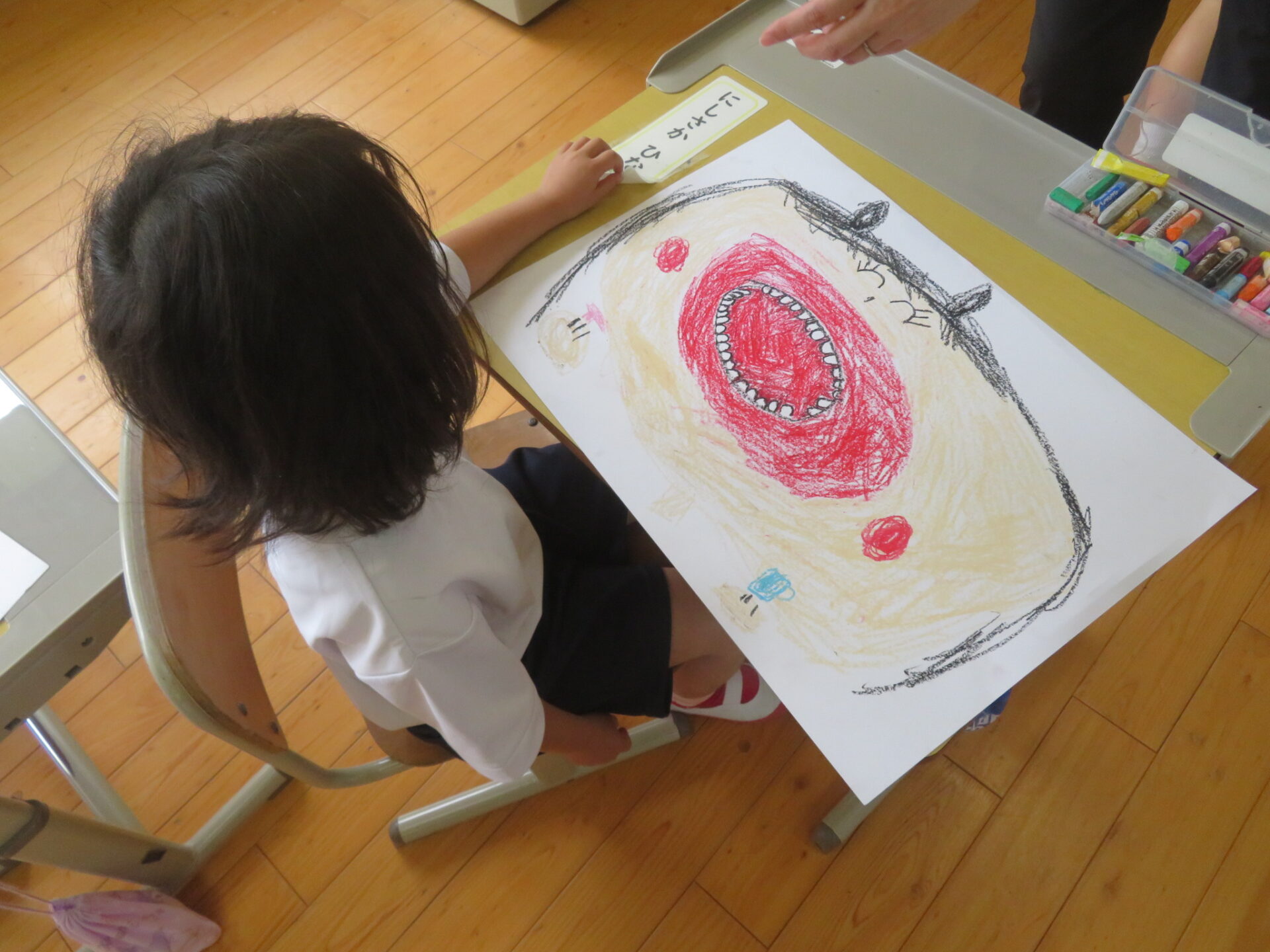 1・2年生が、お口の健康ポスターをかきました。先日、むし歯予防教室でブラッシングを教えてもらったことを思い出しながら、大きな口に歯ブラシをしっかりあてている絵を画用紙いっぱいにかきました。