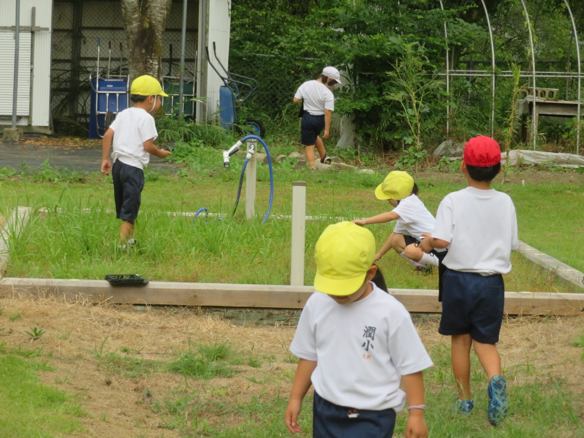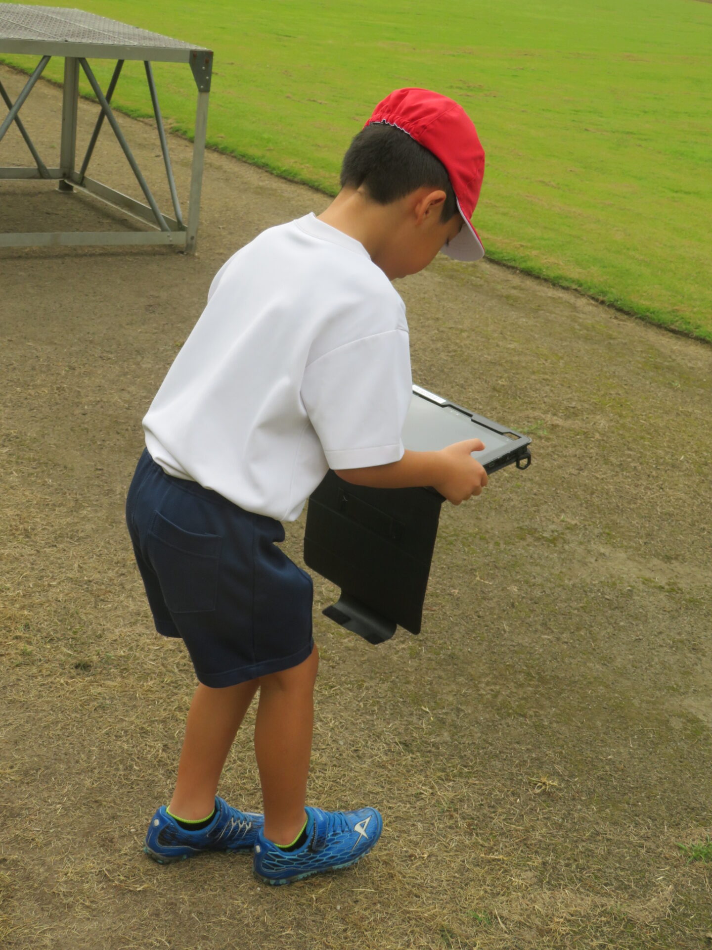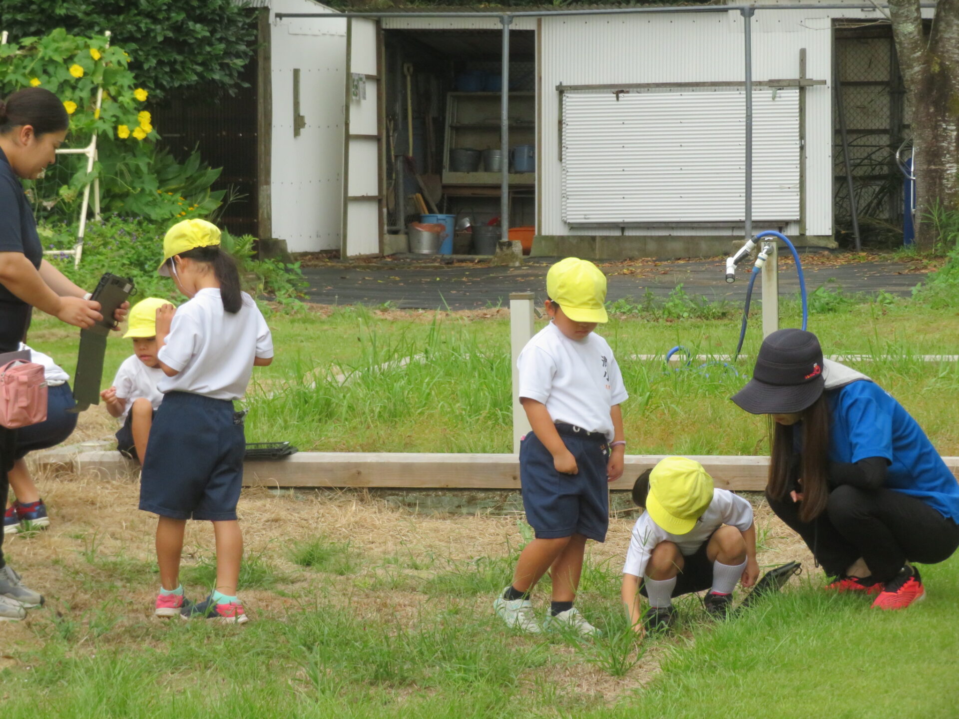 1・2年生が生活科の時間に生き物さがしをしていました。タブレットを片手に、バッタや蝶を見つけて写真をとっています。動く生き物は、写真でとらえるのがなかなか難しそうです。