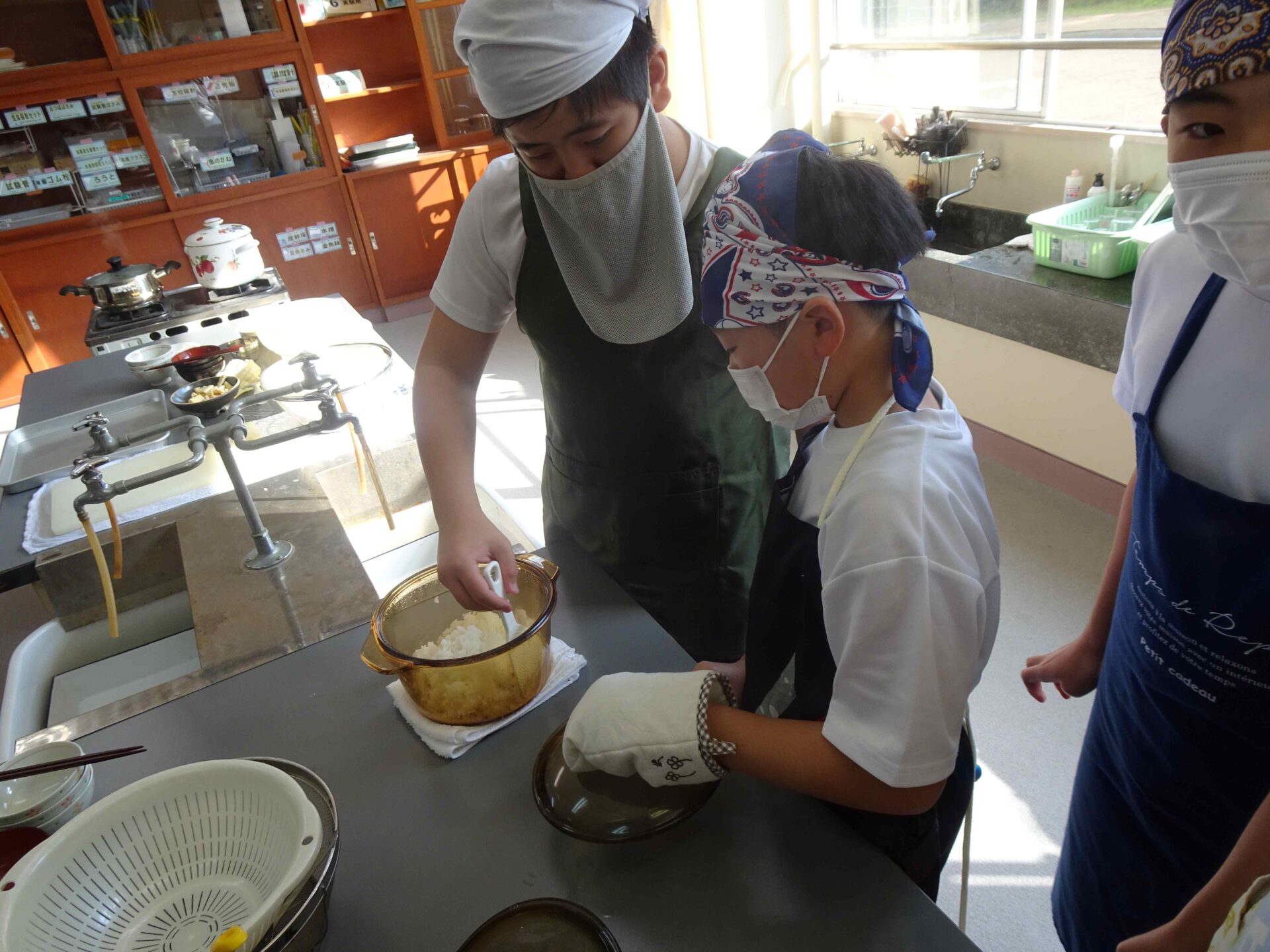 ご飯とお味噌汁を作りました。ガラス鍋でお米の様子を観察しながら炊きました。少々焦げた班もあったようですが、それが美味しかったようです。