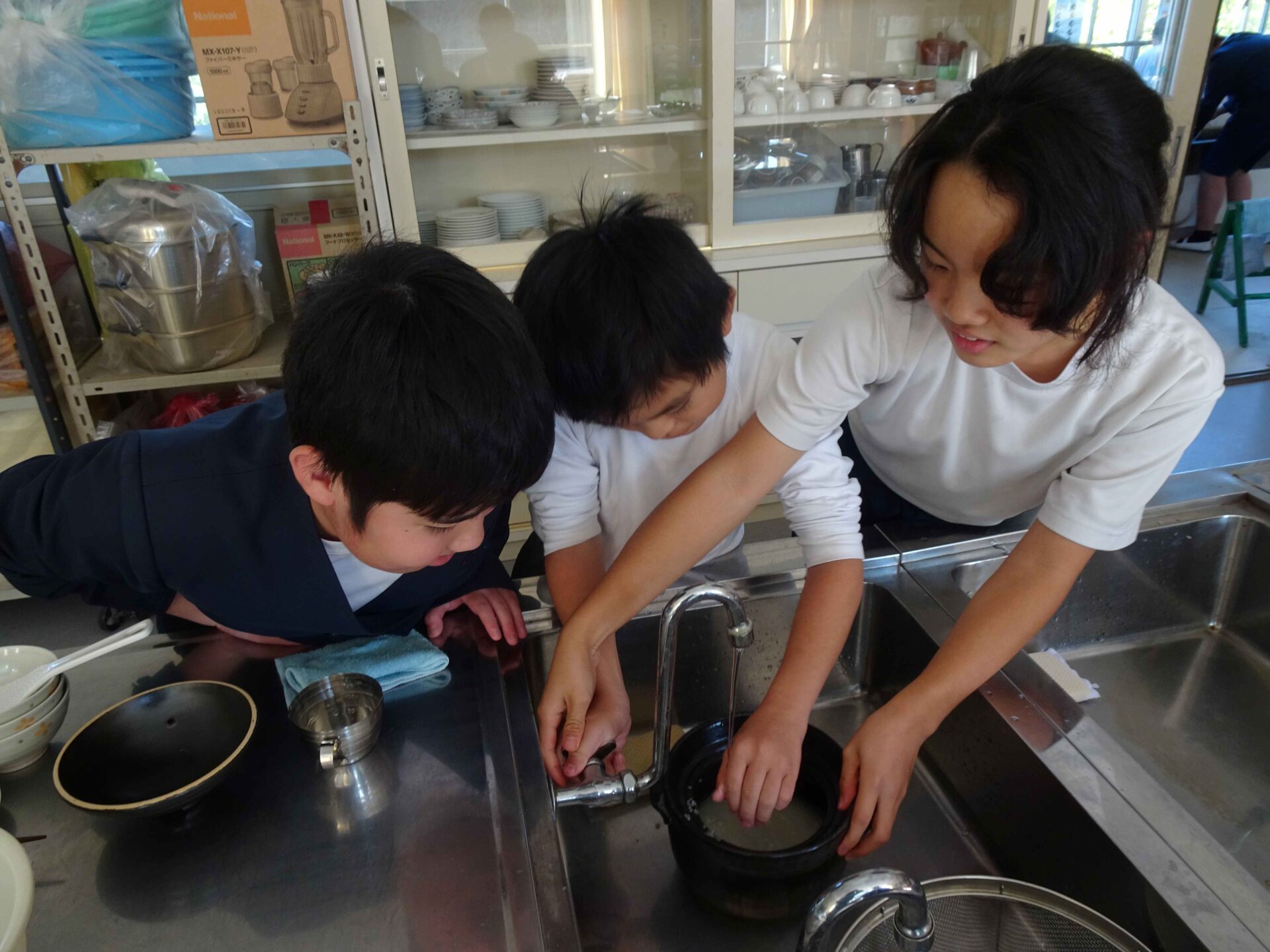 ご飯とお味噌汁を作りました。ガラス鍋でお米の様子を観察しながら炊きました。少々焦げた班もあったようですが、それが美味しかったようです。