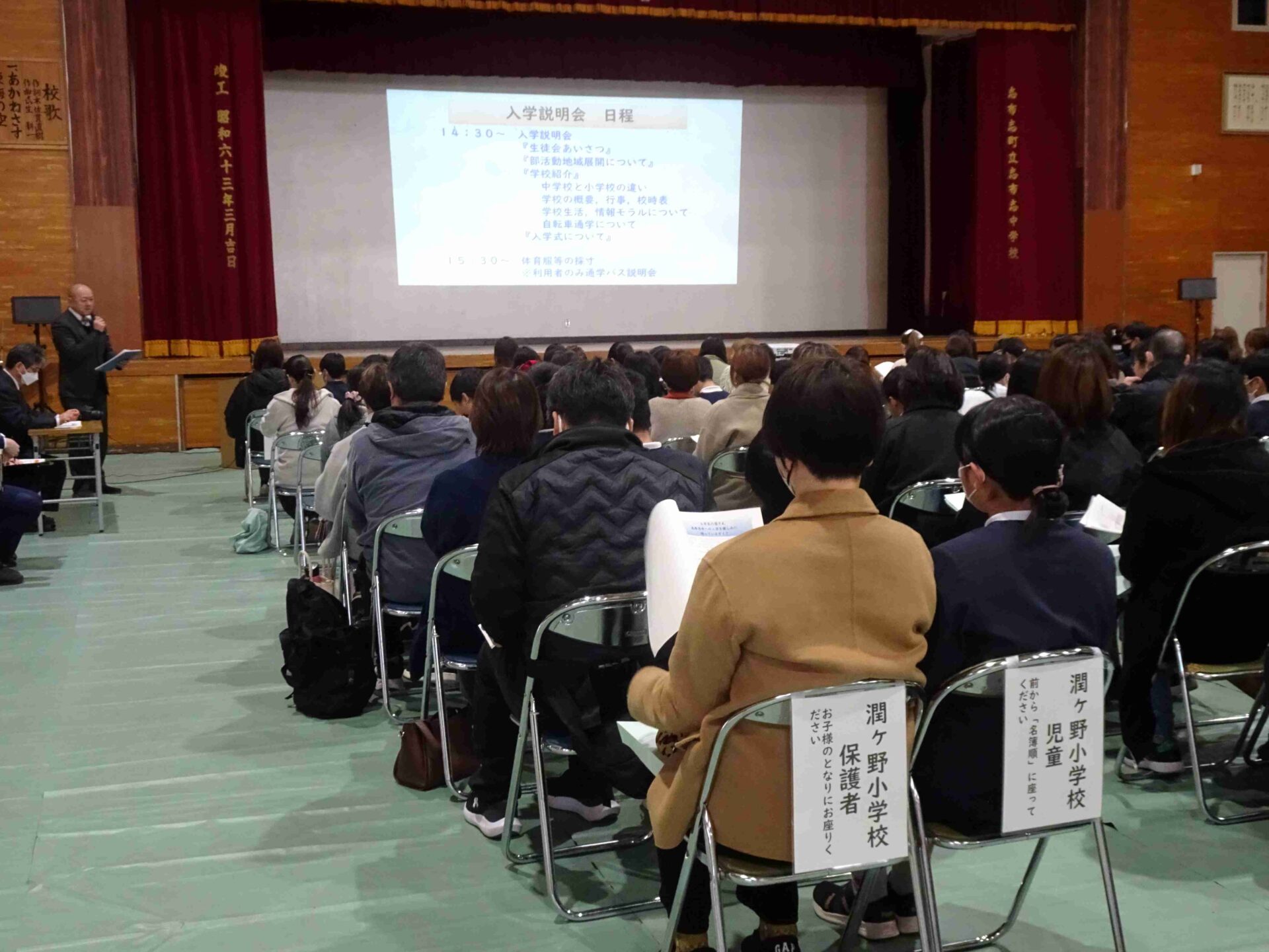 志布志中学校の入学説明会がありました。生徒会長のあいさつや部活動、学校生活について説明がありました。