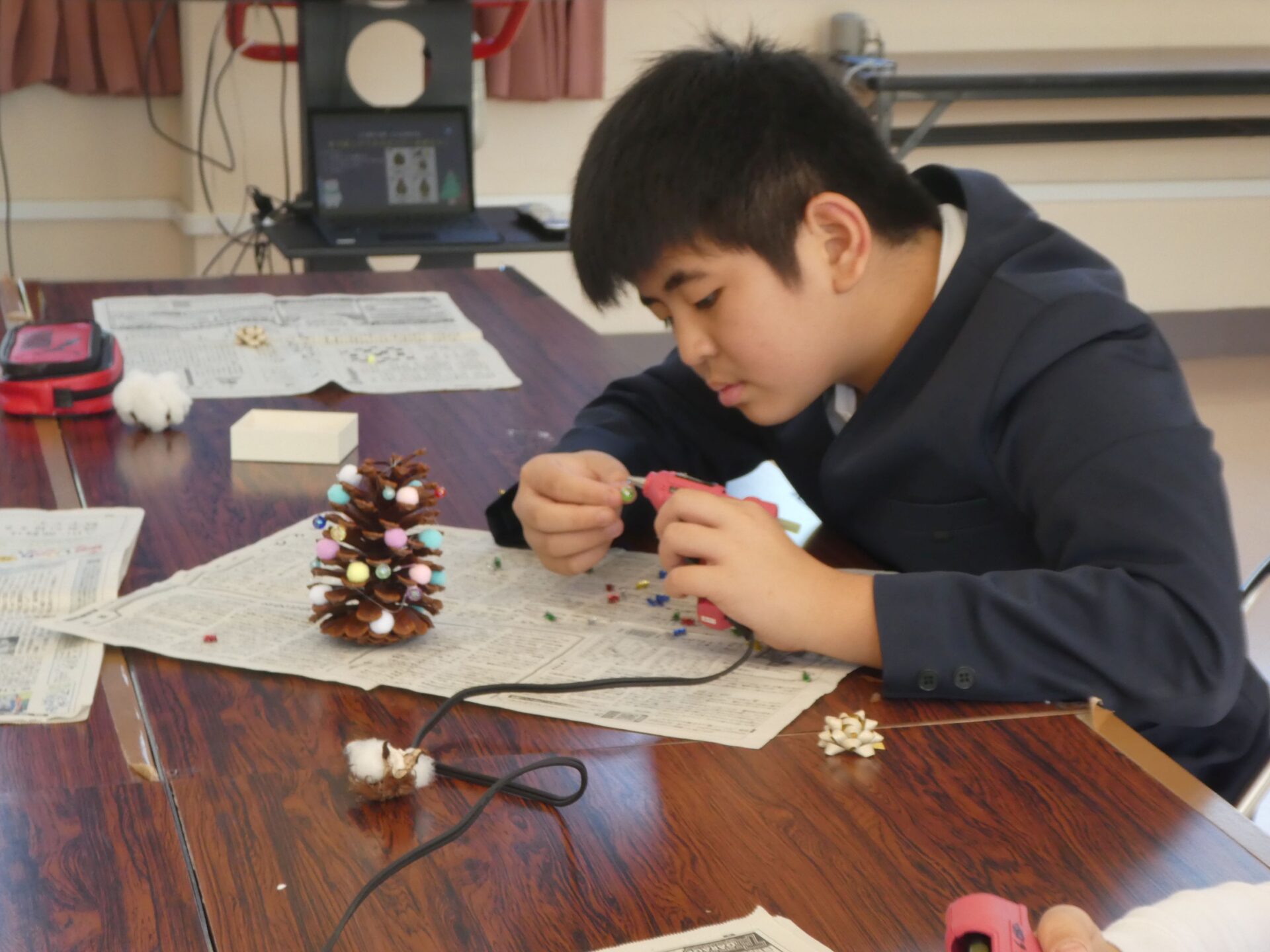 にっこりタイム(自立活動)で、松ぼっくりのクリスマスツリーを作りました。高学年は、グルーガンを上手に使って、飾りを付けていきました。