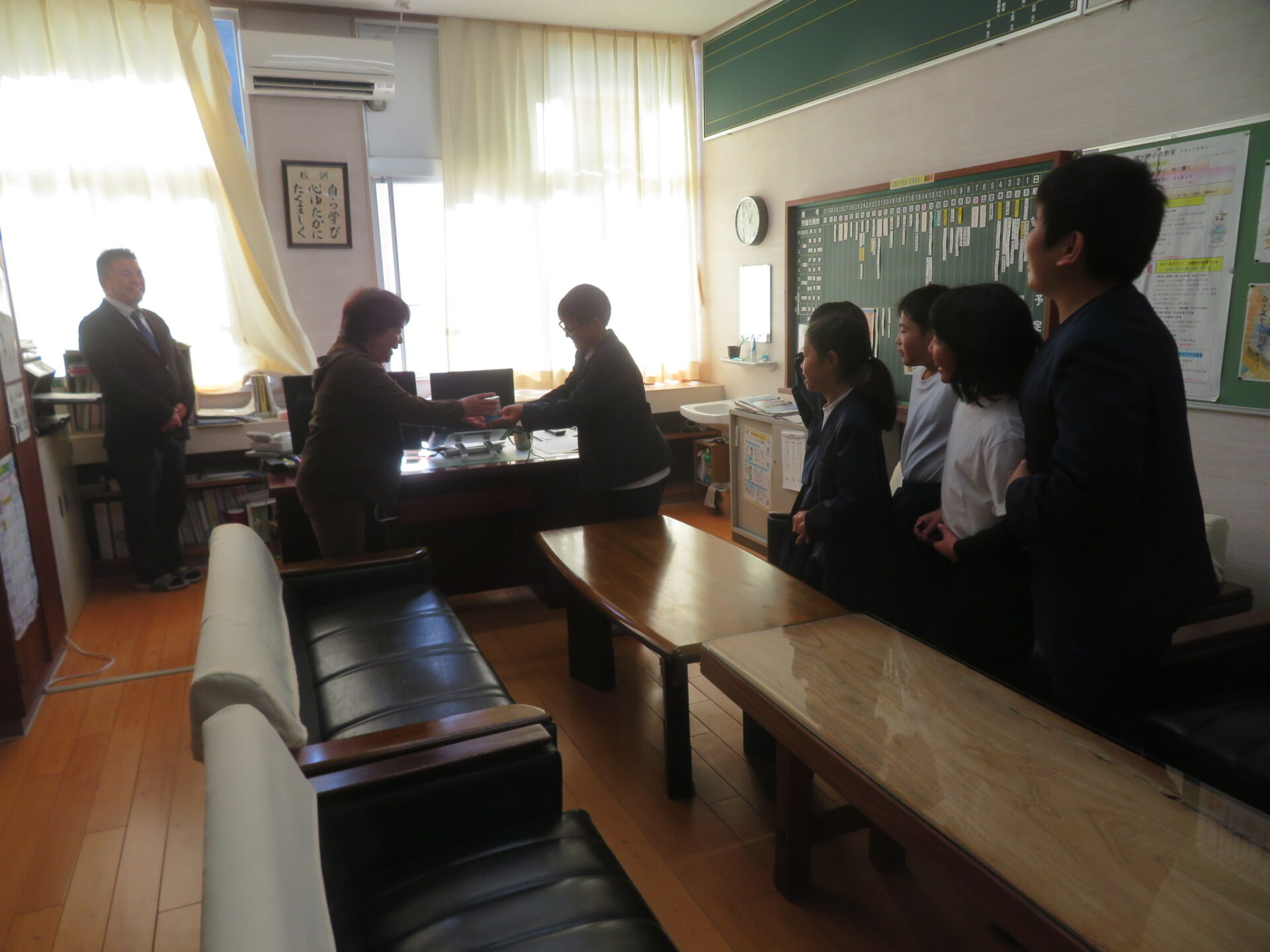 集まった募金を、総務委員会が事務職の方に渡しました。「大切に使わせていただきます。」とお礼を言われました。
