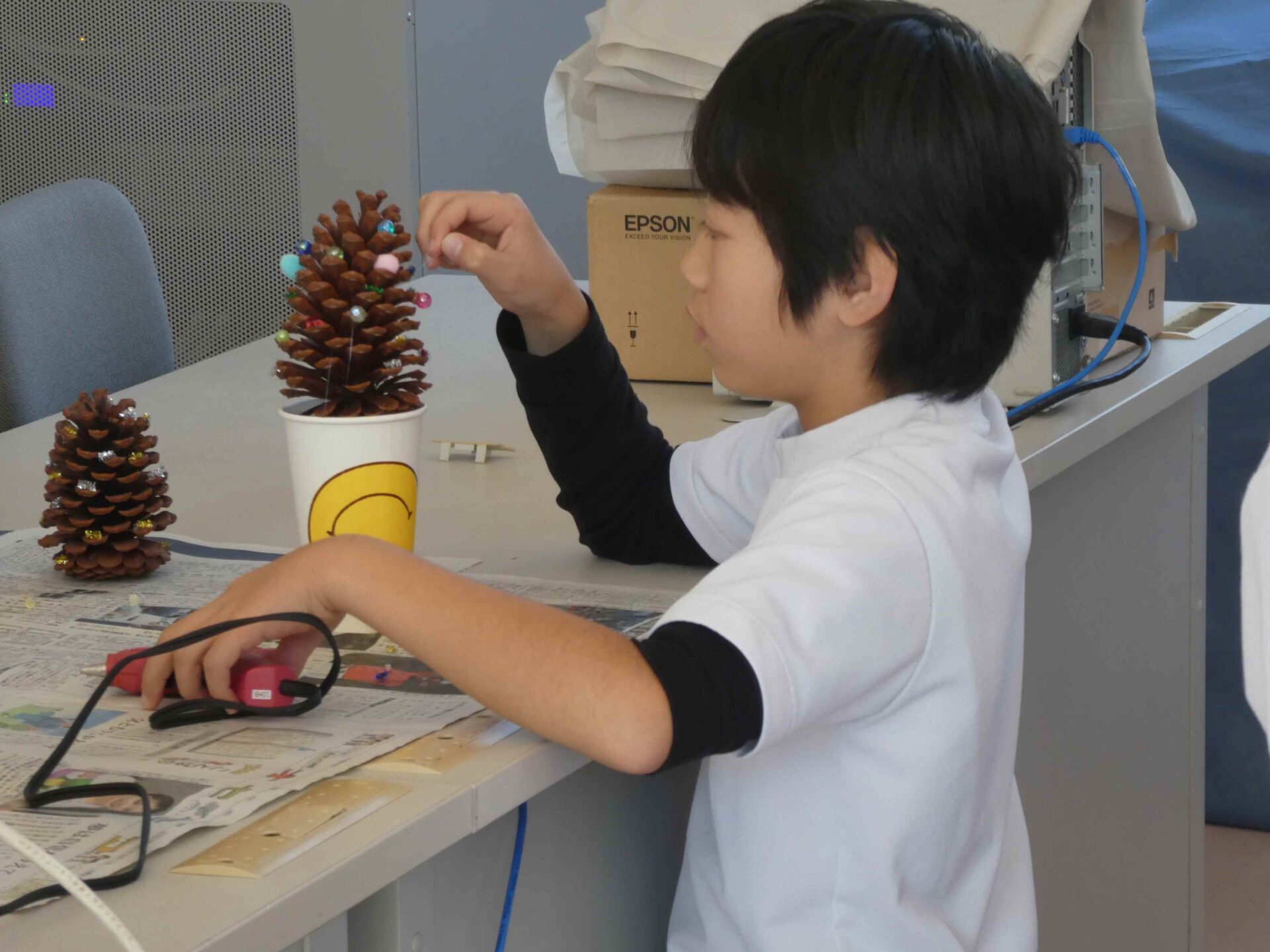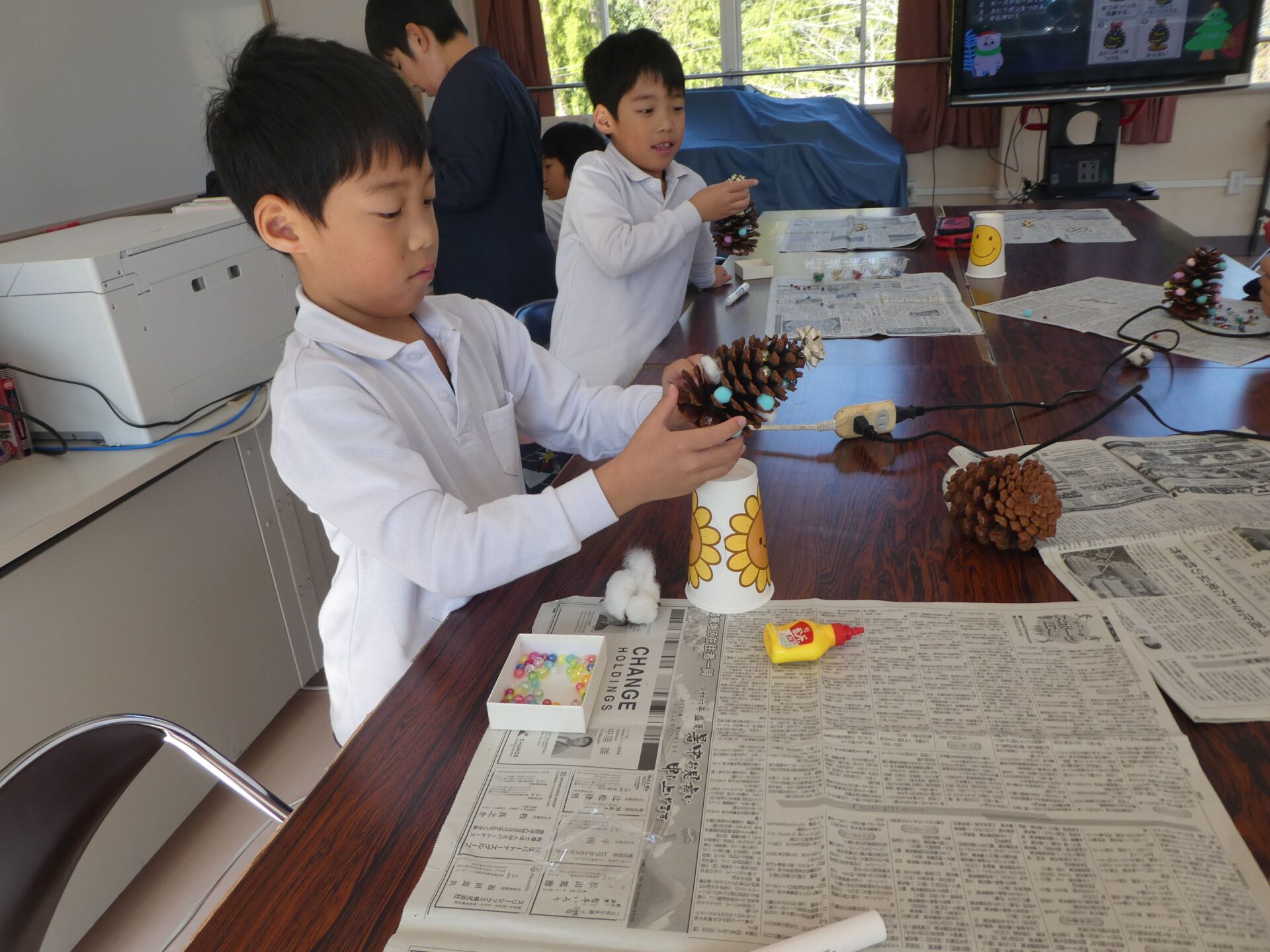 にっこりタイム(自立活動)で、松ぼっくりのクリスマスツリーを作りました。高学年は、グルーガンを上手に使って、飾りを付けていきました。