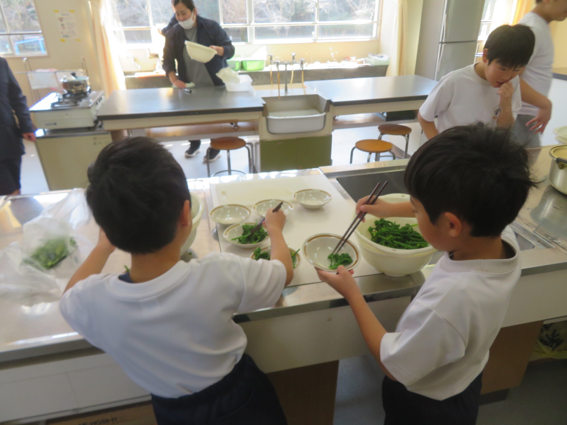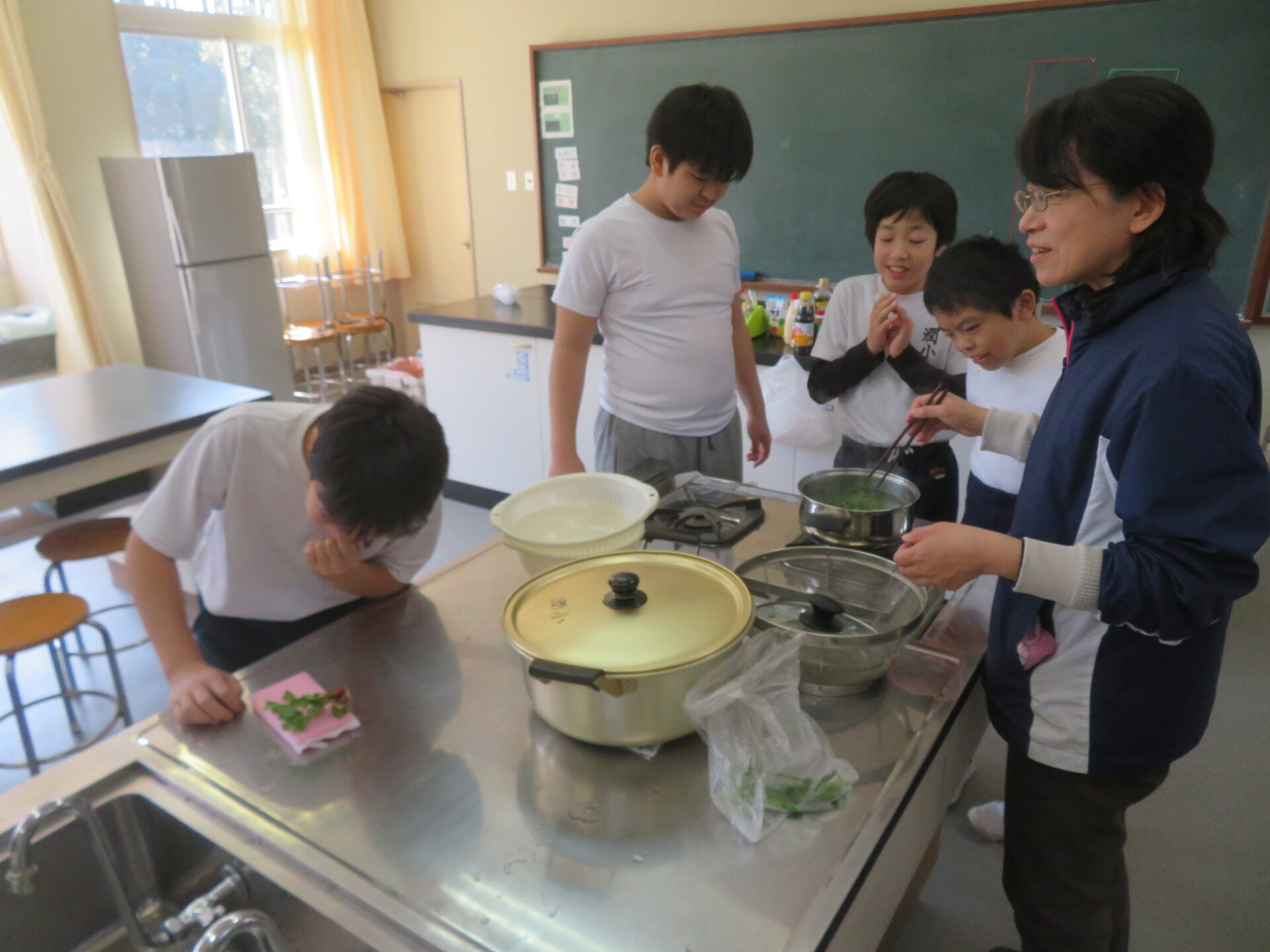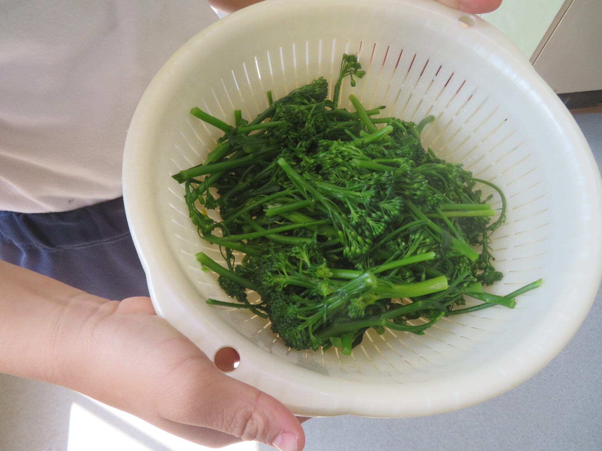 支援学級「にっこりタイム」で、畑で育てたスティックセニョールを収穫し、茹でて食べました。自分たちで育てた野菜を食べることができ、格別のおいしさだったようです。みんな積極的に調理に参加していました。