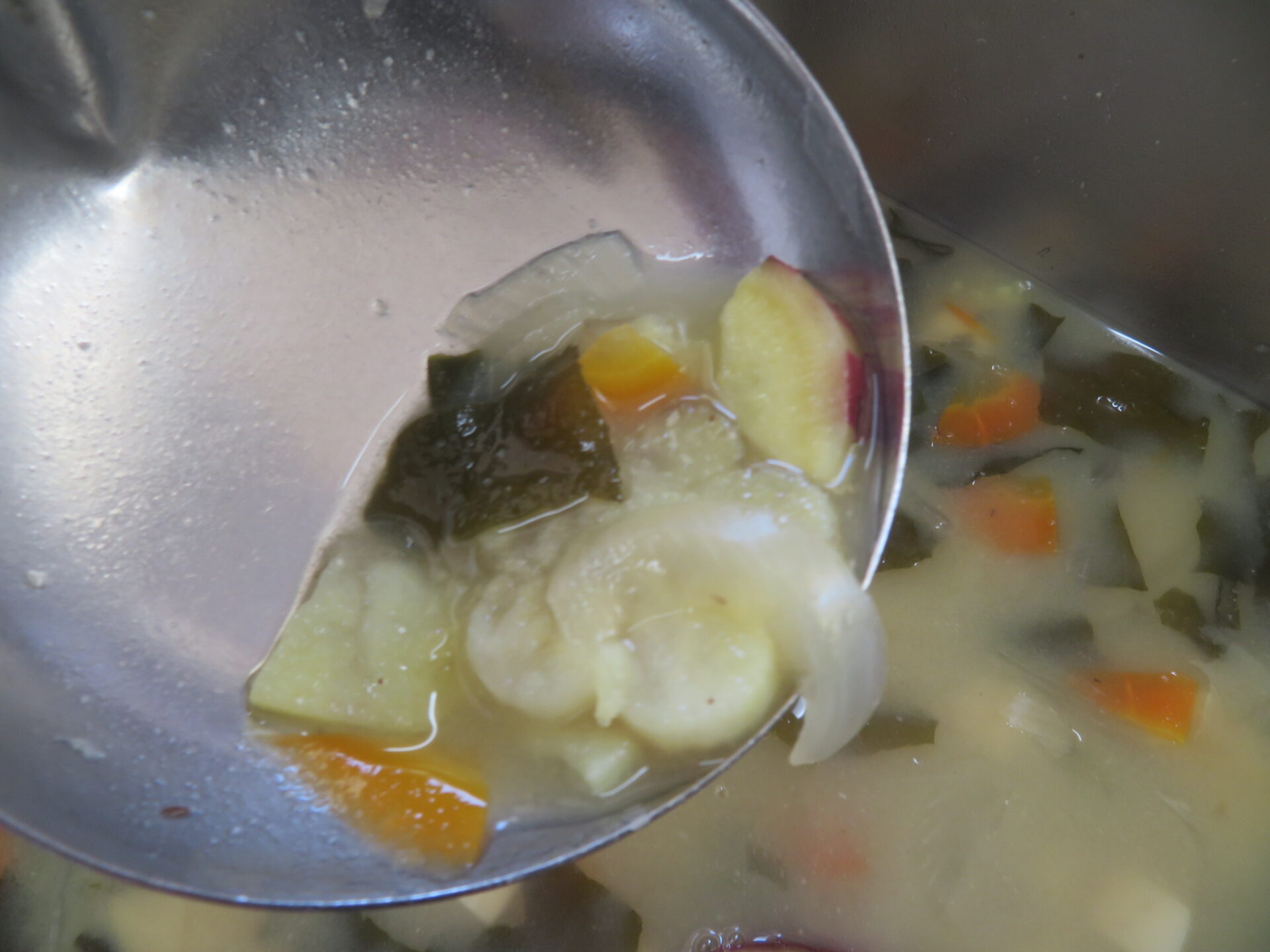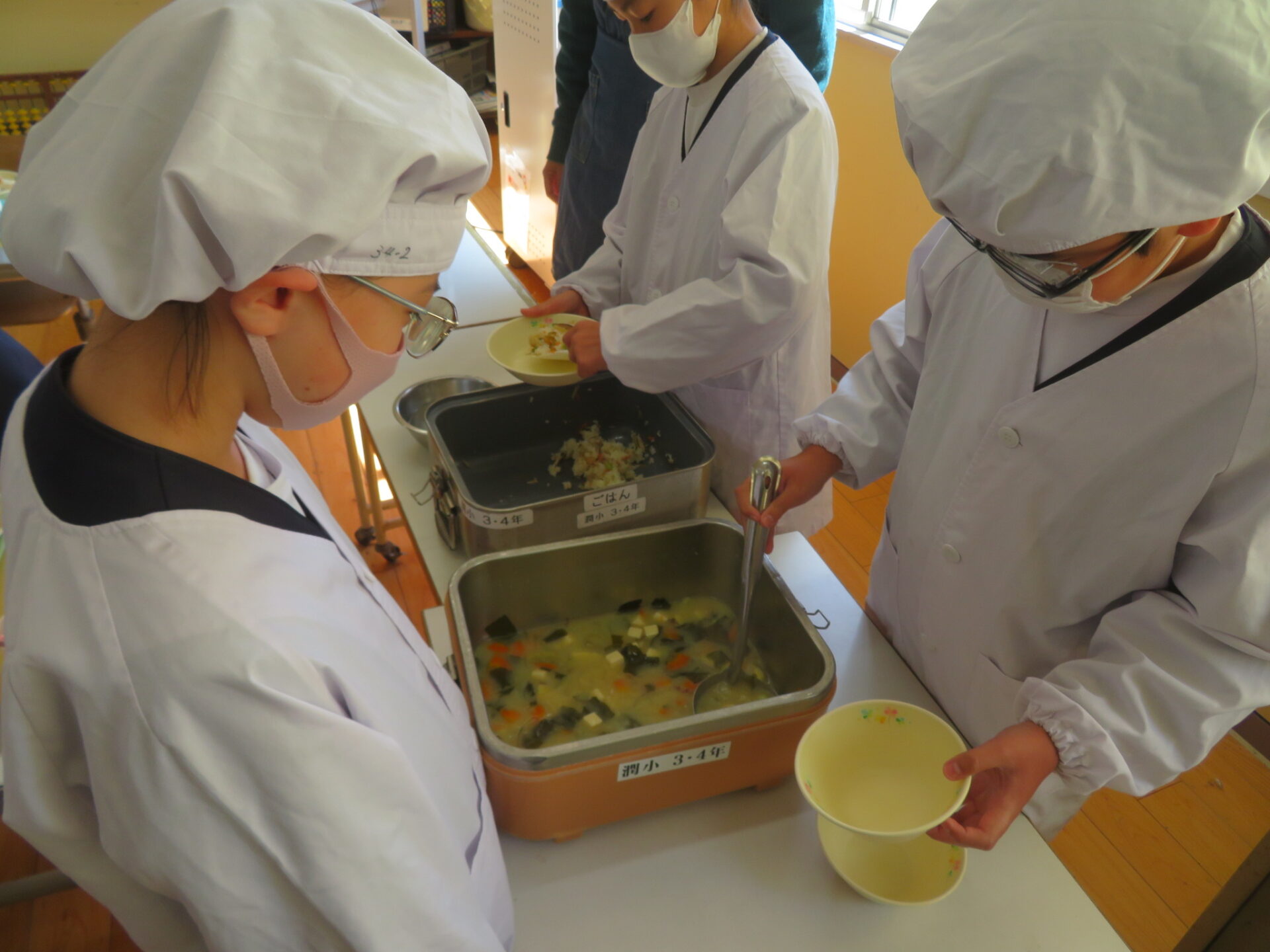 献立の「さつまいもの味噌汁」は、潤ケ野小の子どもたちが地域の方と一緒に育てたサツマイモが登場したのです。給食センターからのサプライズで、お芋を星形や花型にくりぬいた「あたり」もありました。
