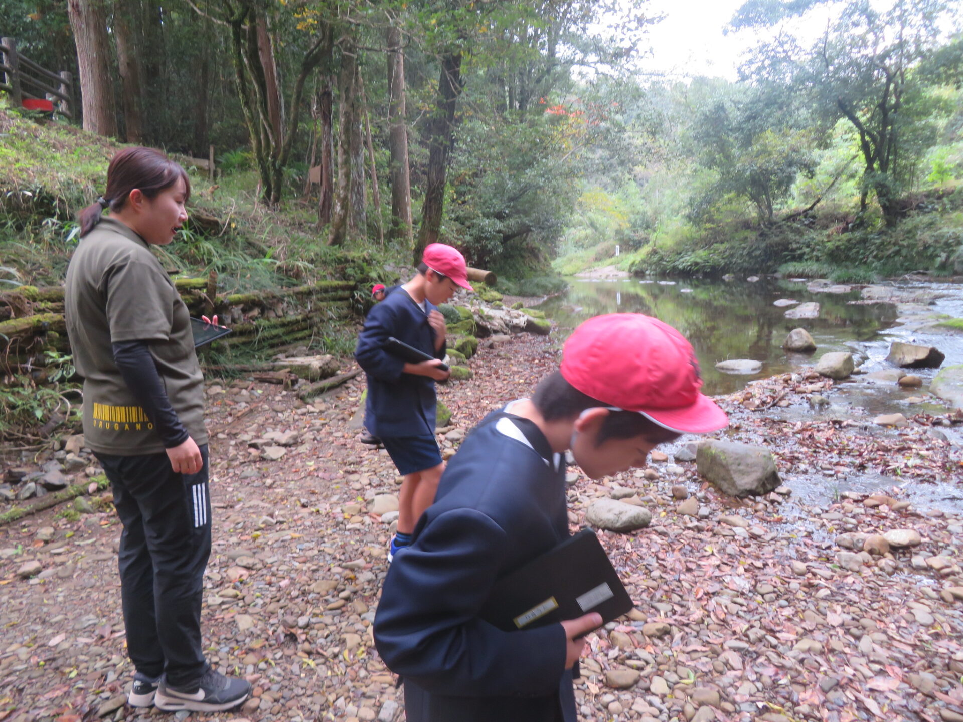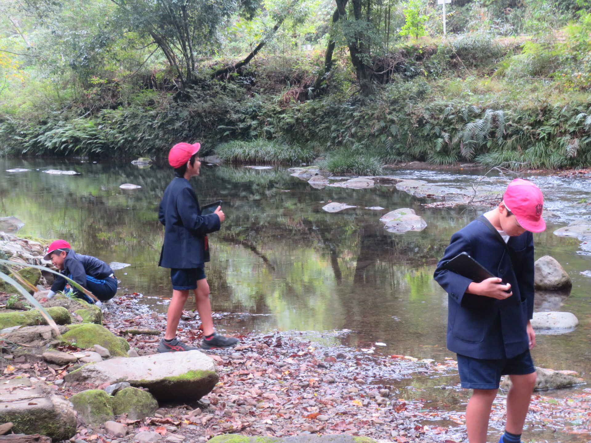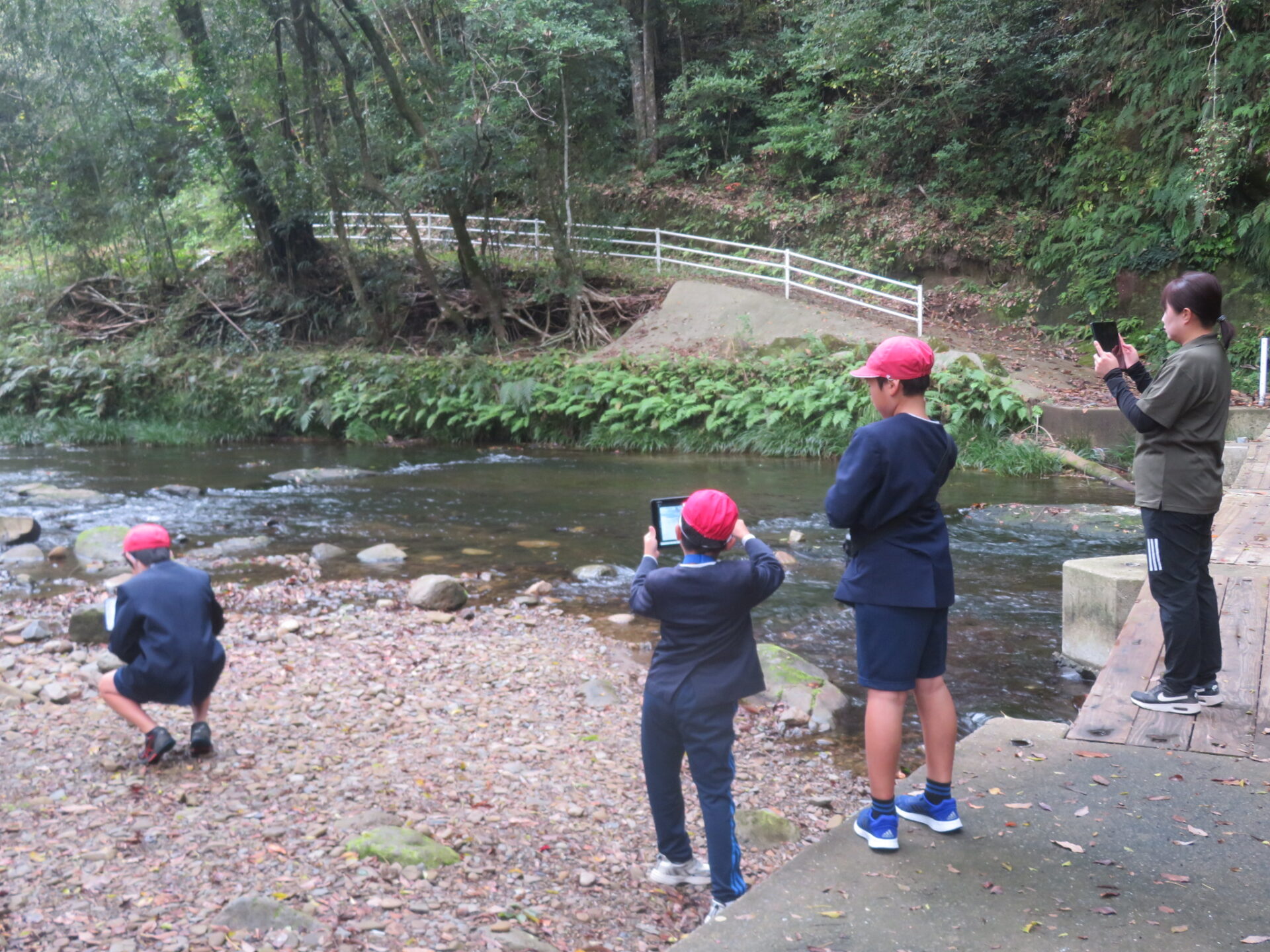 5年生が、「流れ水の働き」の学習で前川に行きました。石がたまりやすいところはどこか、深くなっているのはどんなところか、流れが速いのはどちらの岸か、などを見て確かめました。タブレットで様子を撮影し、教室でのふりかえりに生かします。