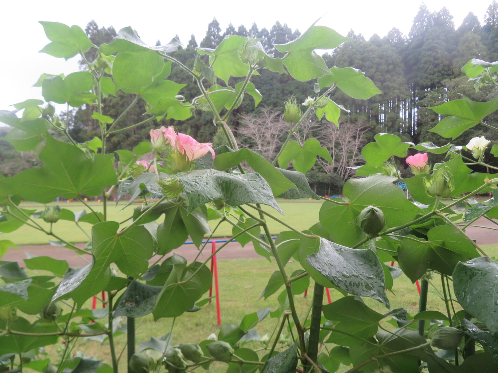茎の上の方はピンク色の花が咲いて、根元の方はほわほわの真っ白い綿ができています。とてもきれいです。触ってみると、本当に売り物のような綿がついていて感動しました。