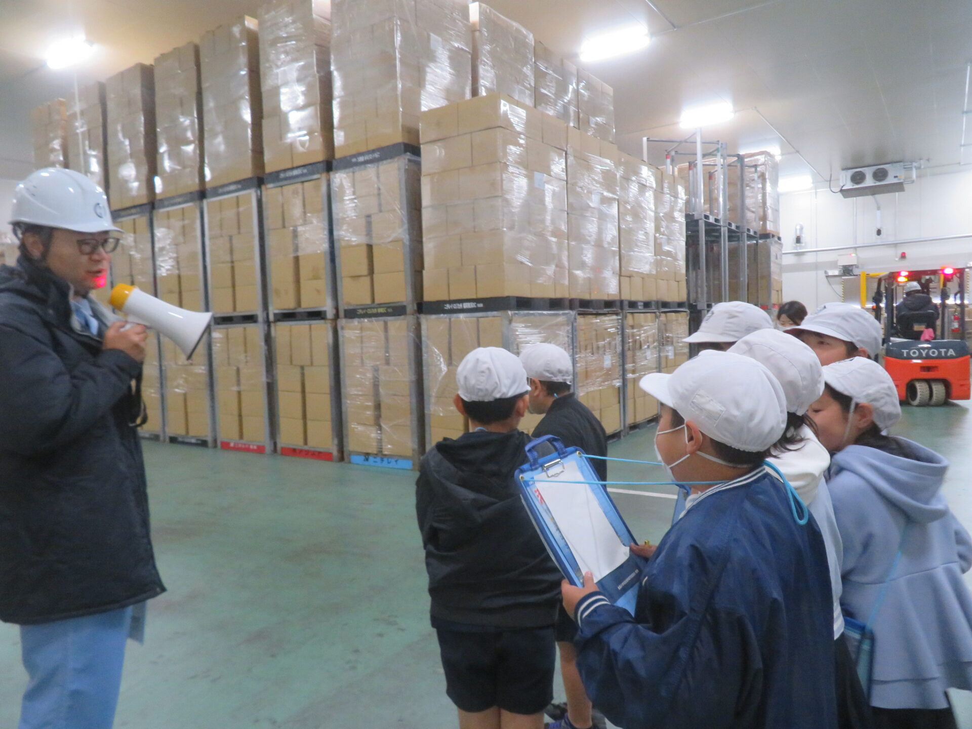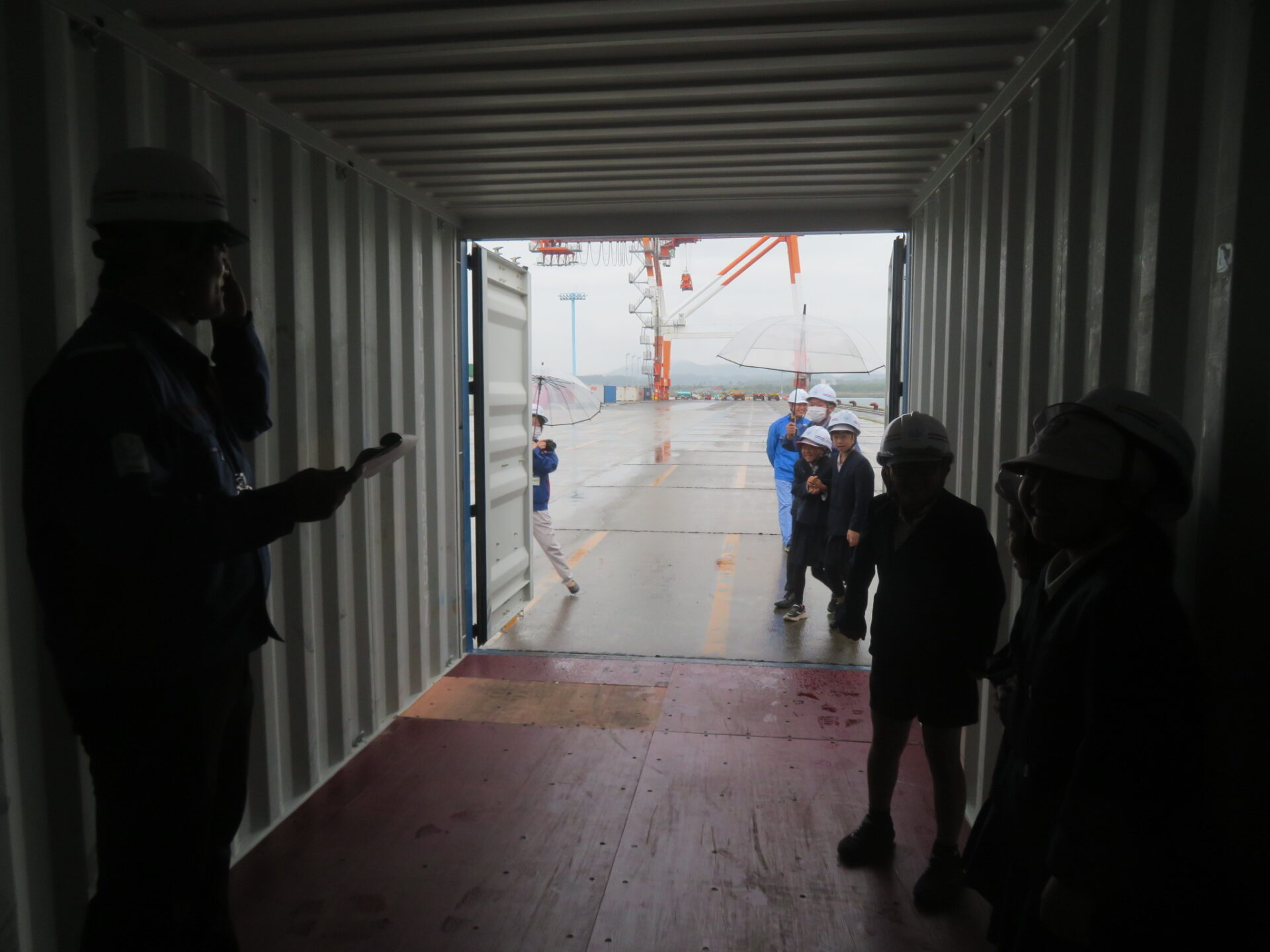 志布志港では、コンテナを運ぶためのクレーンを見たり、実際にコンテナに入ったり、冷凍庫に入ったりしました。
