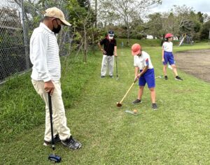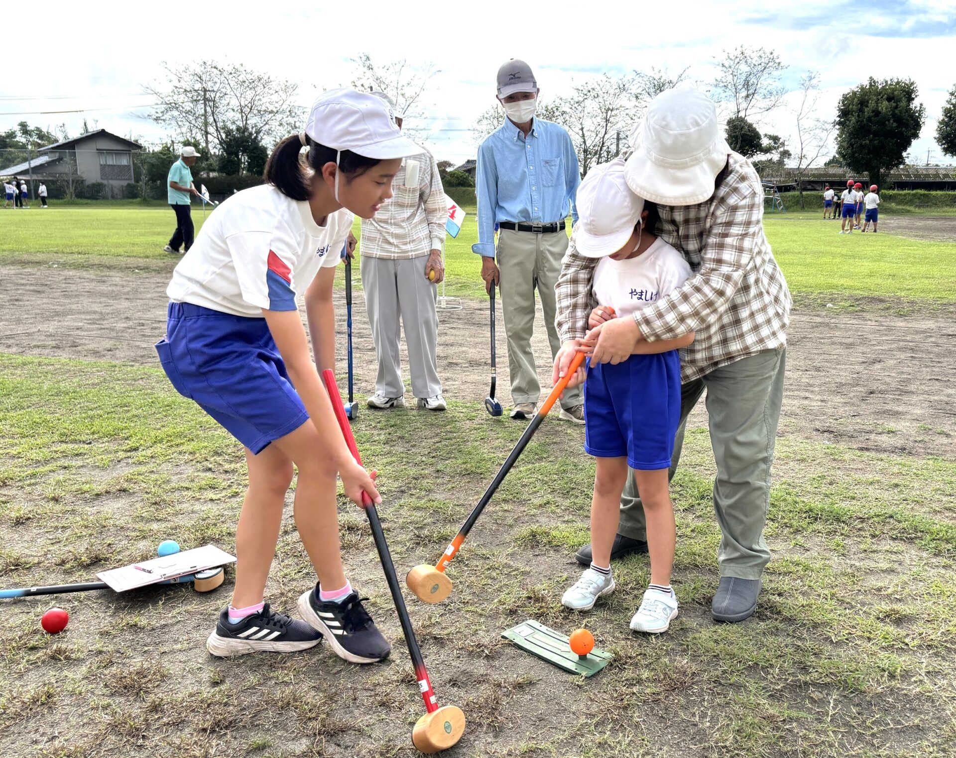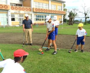 山重校区の老人クラブの方々にお越しいただき,子供たちとグラウンドゴルフを行いました。子供たちが,ボールの打ち方等を教えていただきながら,プレーの中で会話をしながら楽しく過ごすことができました。