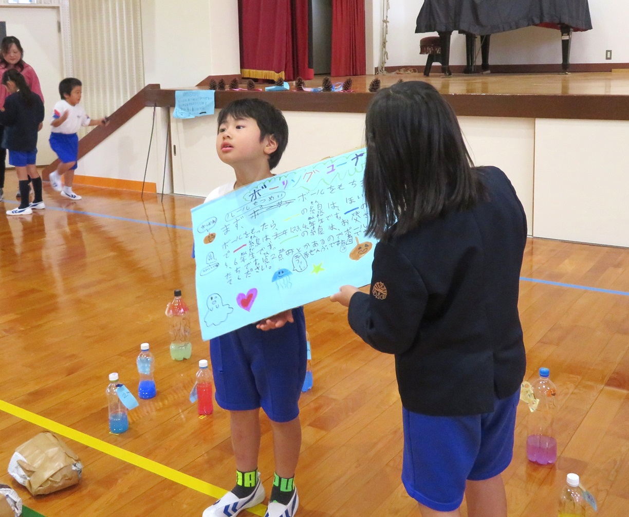 その後は,各ブースで射的,さかなつり,手裏剣投げ,ボウリング,牛乳パックタワー等,子供たちが準備したものを使って,楽しく過ごすことができました。