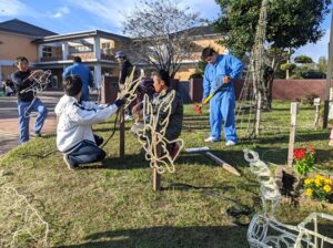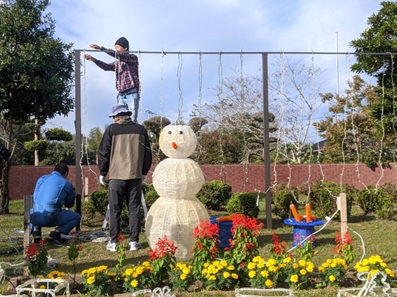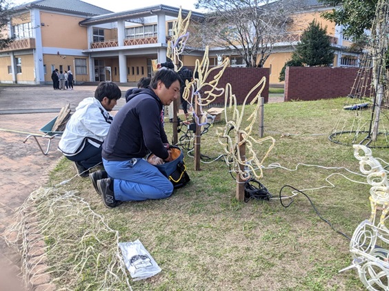 11/24 イルミネーション設置 作成者 yamashige admin公開日 2024年11月24日 先週から準備を進めてきたイルミネーションを設置しました。 夕方に点灯式を行いました。カウントダウンの合図で鮮やかに点灯しました。