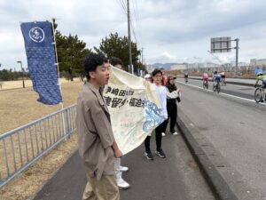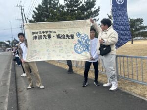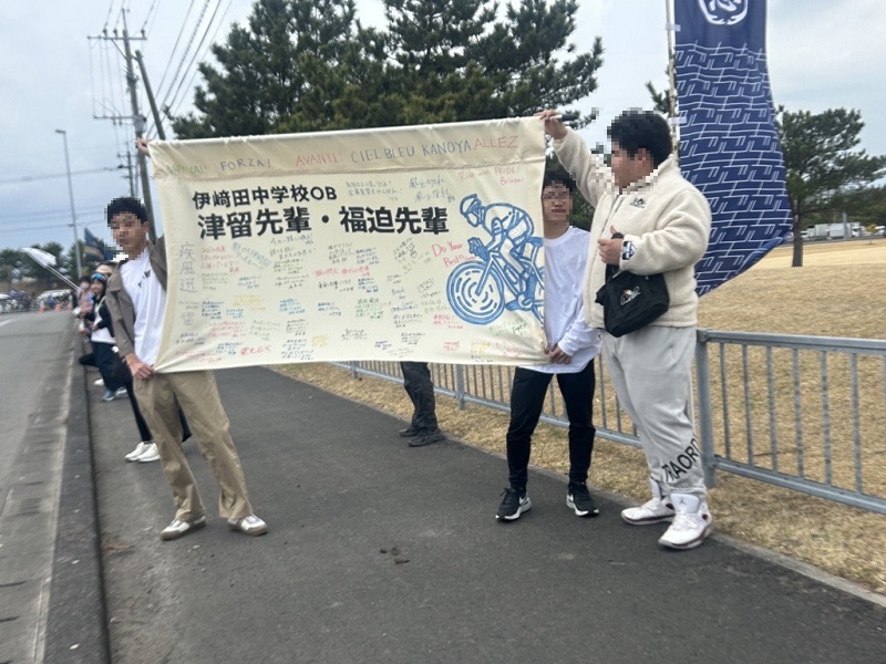 そして、この日のために、全校生徒と職員で心を込めて作成したのが「寄せ書き入りの横断幕」です。当日はあいにくの休日でしたが、中学3年生の有志3名が応援に駆けつけてくれました。彼らは、レース中、先輩たちが苦しい局面でみんなのメッセージが目に飛び込むよう、場所を考え、腕を高く掲げて横断幕を広げ続けてくれました。