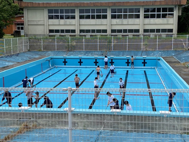 本日は快晴。2時間目は3年生が,3時間目は2年生が,そして4時間目は1年生がプール掃除に一生懸命がんばりました。