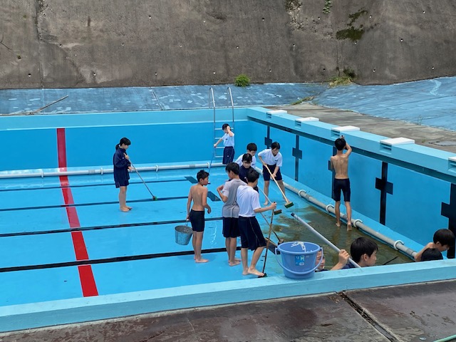 全校生徒が交代で,黙々とプールの床や壁をデッキブラシで磨いていました。また,プールサイドに生えた雑草をとる生徒,更衣室掃除を丁寧に行う生徒もいました。