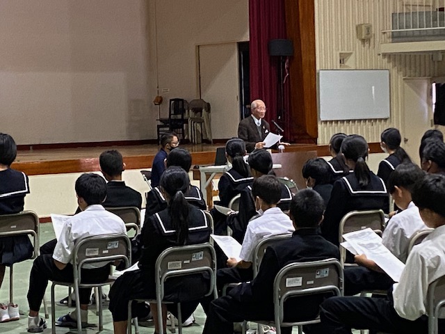 岩川に基地があったということや芙蓉部隊についてのお話、そして自分たちの地域にも戦跡があるという事実を知り、生徒たちは興味深い様子で講話を聞いていました。また「あらためて特攻という戦術の恐ろしさや戦争の酷さ、平和の尊さに気づいた」という感想をもった生徒たちも多かったようです。