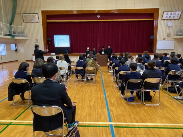 中学校の1日の流れや行事、授業など,各担当職員と生徒会役員が、スライドや動画を活用して中学校生活について説明しました。