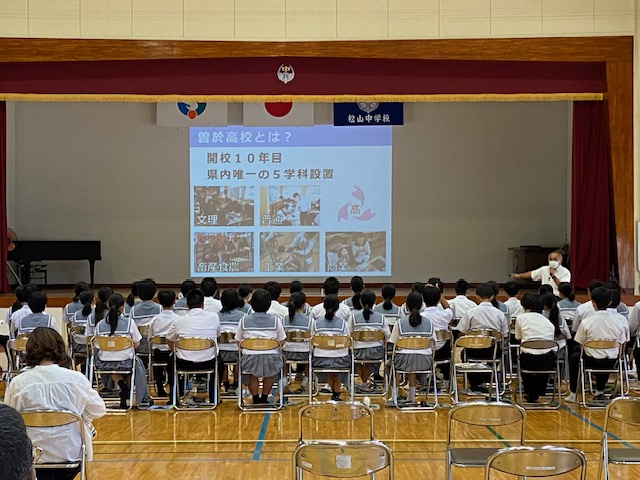 今年度は,大隅地区の公立高校(曽於高校,志布志高校,鹿屋農業高校),私立高校(尚志館高校,鹿屋中央高校),都城市の私立高校(都城高校,都城東高校)の計7校の先生方をお招きし,2・3年生とその保護者を対象に本校体育館にて実施いたしました。