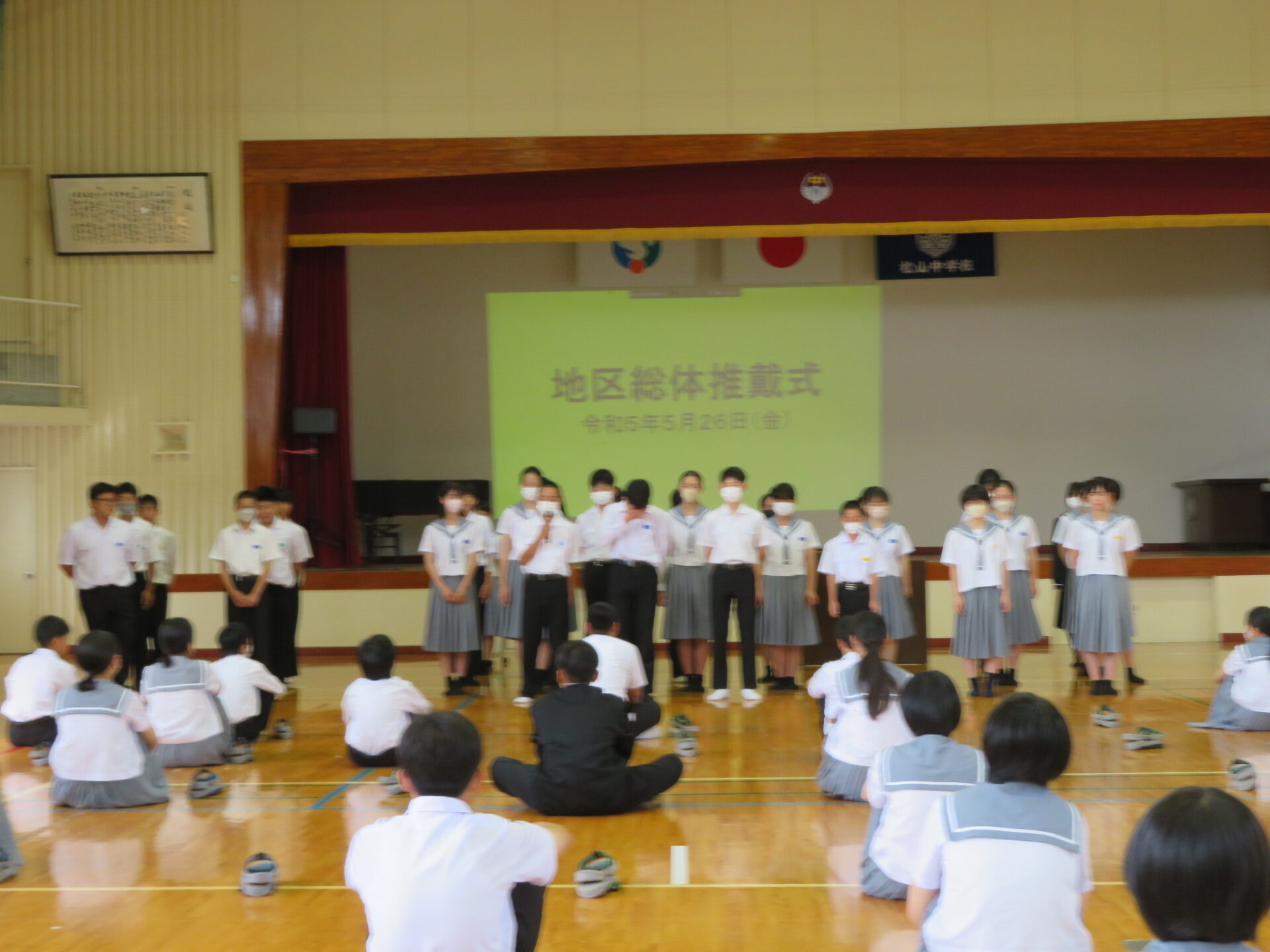 地区総体推戴式 作成者 matsuyamatyuu_admin公開日 2023年5月26日 6月6日から行われる中体連地区総体(築城競技は5月17日実施)の推戴式が本日の全校朝会の中で行われました。本校からは野球,女子バレー,弓道,剣道の4つの部活動が出場します。悔いのないように全力でがんばって下さい。